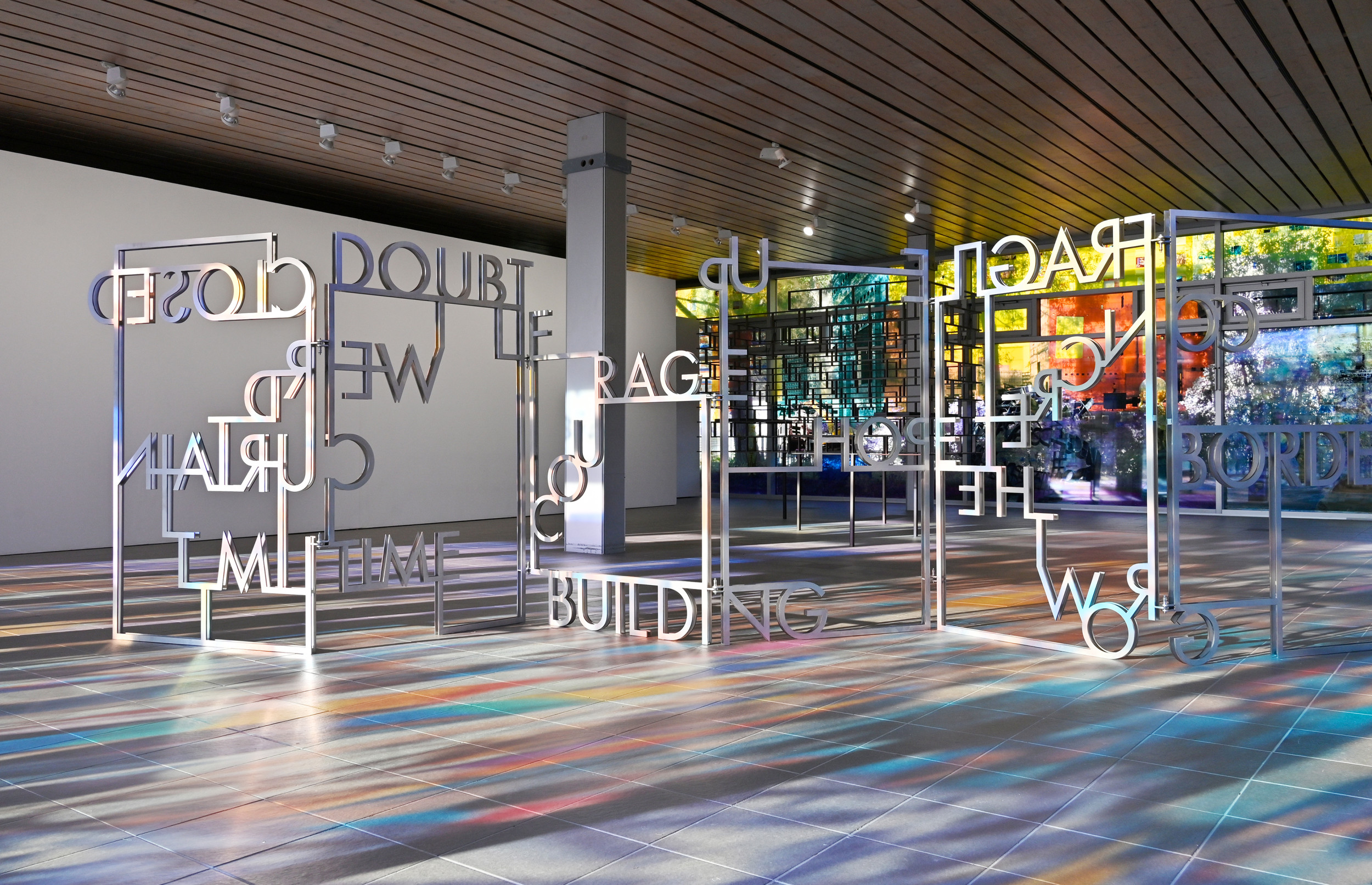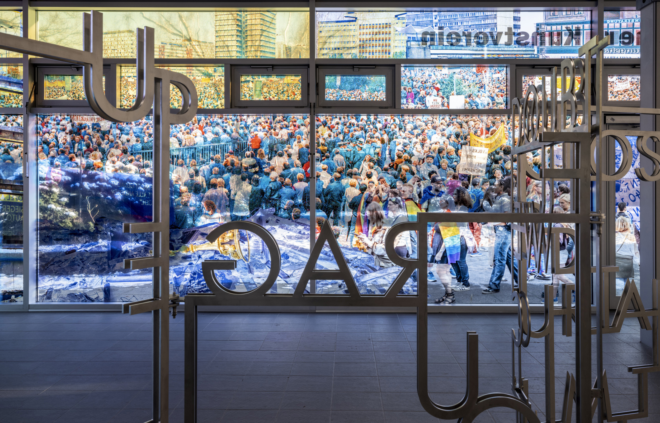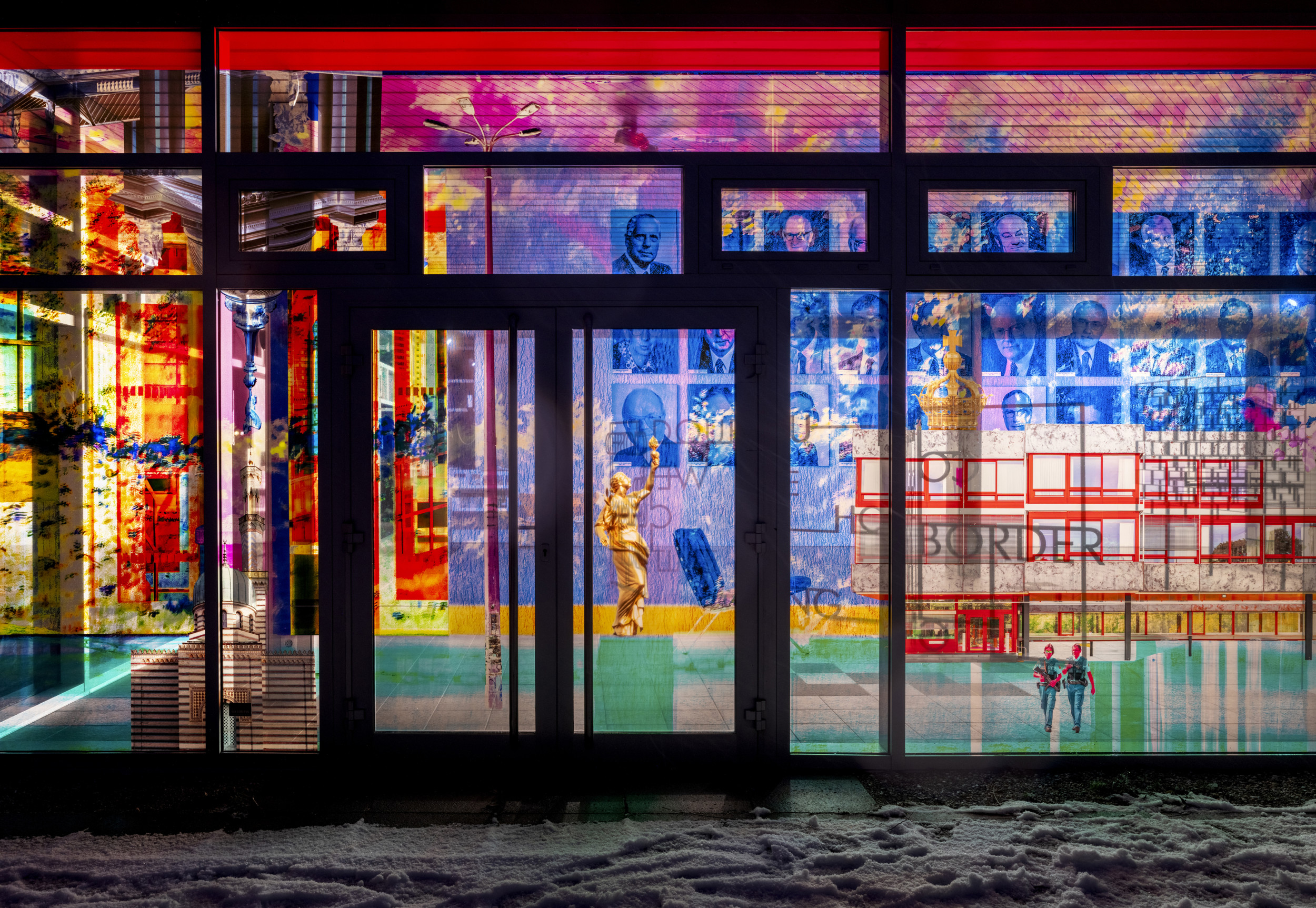 Hornig setzt damit eine vielbeachtete Werkserie im öffentlichen Raum fort, in der sie sich mit dem Selbstverständnis offener Gesellschaften auseinandersetzt, wie etwa 2020 in einer fast 13 Meter hohen Installation auf der Glasfassade des New Yorker LaGuardia Airports. Dort verschmolzen die Geometrien der Metropole mit Textfragmenten zu einem Mikrokosmos der Kulturen. Auch eine gerade entstehende Arbeit an einem Neubau des Deutschen Bundestages befasst sich mit dem Spannungsverhältnis von Demokratie- und Baugeschichte.