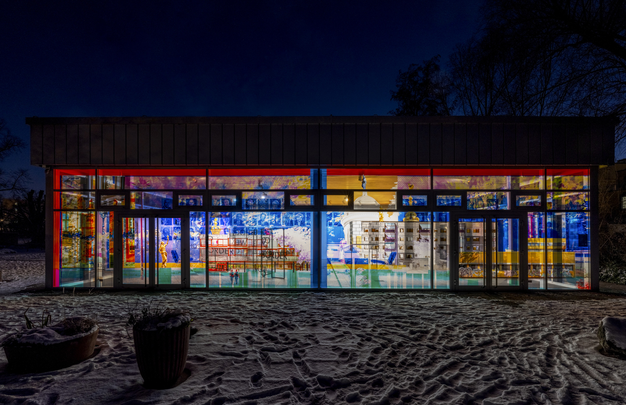 Von Oktober bis Februar zeigt der BKV Potsdam eine Rauminstallation von Sabine Hornig, die den Ausstellungspavillon auf der Freundschaftsinsel temporär in eine Skulptur aus Licht und Farbe verwandeln wird. Sie setzt sich mit der Moderne in der Architektur und ihren demokratischen Versprechen auseinander. Dabei nimmt die 43 Meter lange transparente Photo-Collage auch auf das Ausstellungsgebäude selbst und sein städtebauliches Umfeld Bezug.