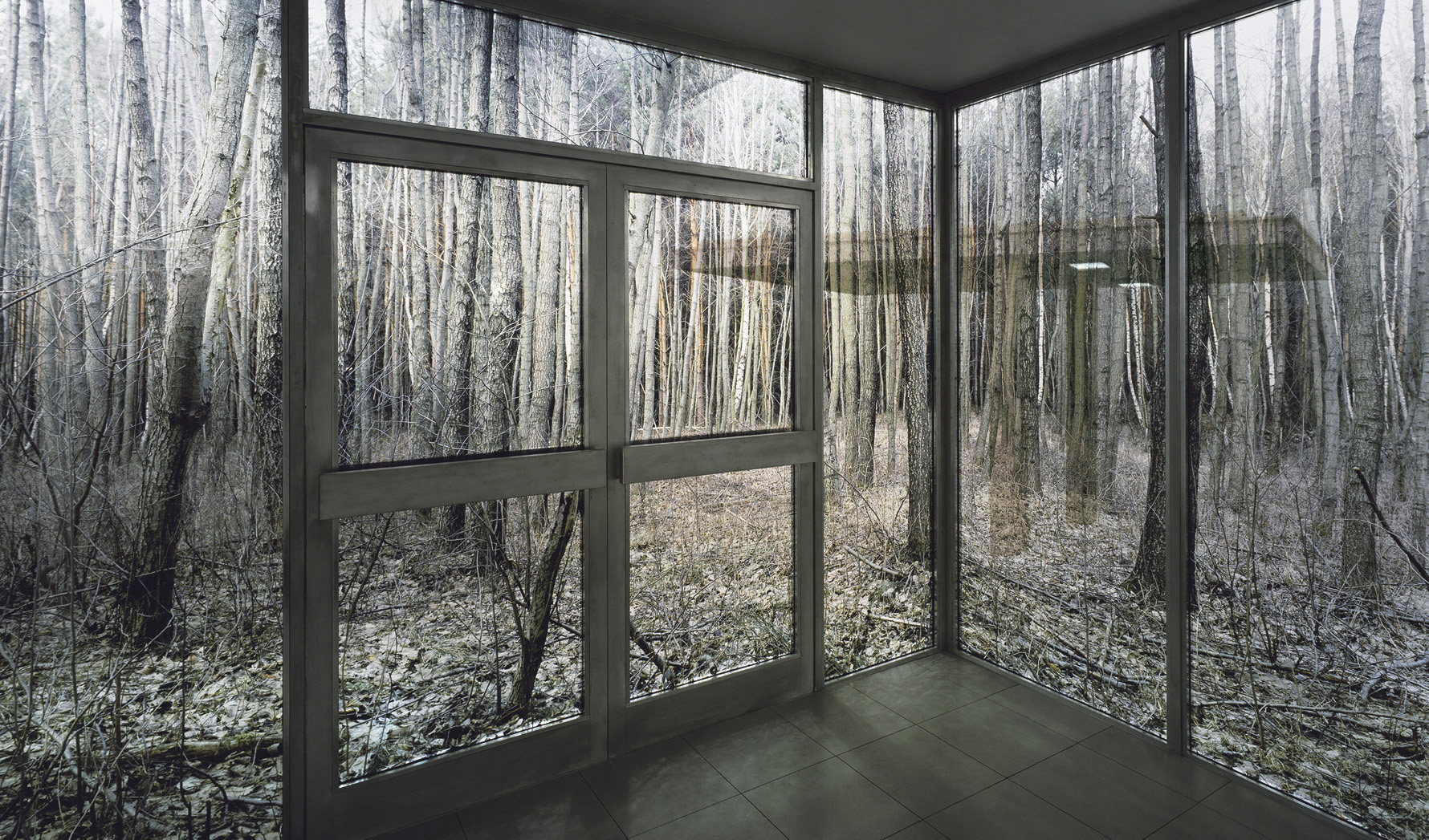 Durch eine Öffnung in der gegenüberliegenden Wand gelangen wir in einen geschlossenen Raum, der sich als vergrößertes Double des kleinen Kubus erweist, jedoch diesmal nur von innen zu sehen ist, denn mit ihm stehen wir plötzlich mitten im Wald. Das Diapositiv einer Waldfotografie ist flächendeckend in die Glaswände eingelassen und projiziert das Bild in den Umraum, in dem wir weiter hinten das verkleinerte Doppel des vorspringenden Daches erkennen, diesmal mit eingeschalteter Beleuchtung.