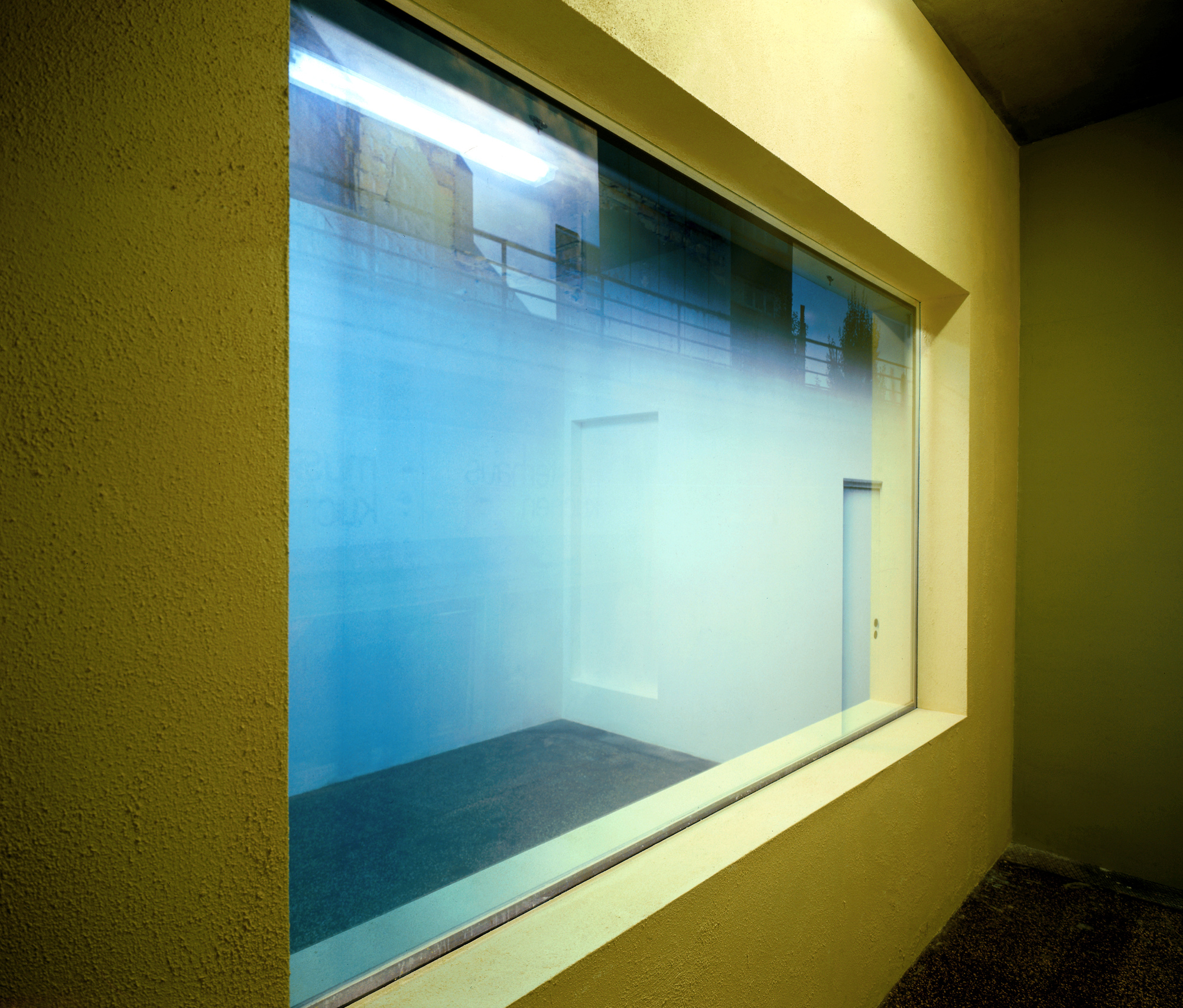 In zwei nebeneinanderliegende gleich große quadratische Räume sind zwei Fassadenwände mit Schaufenstern hineingebaut. Dadurch wird jeweils ein Teil des Raumes von dem begehbaren abgetrennt und nur durch das Schaufenster hindurch einsehbar.