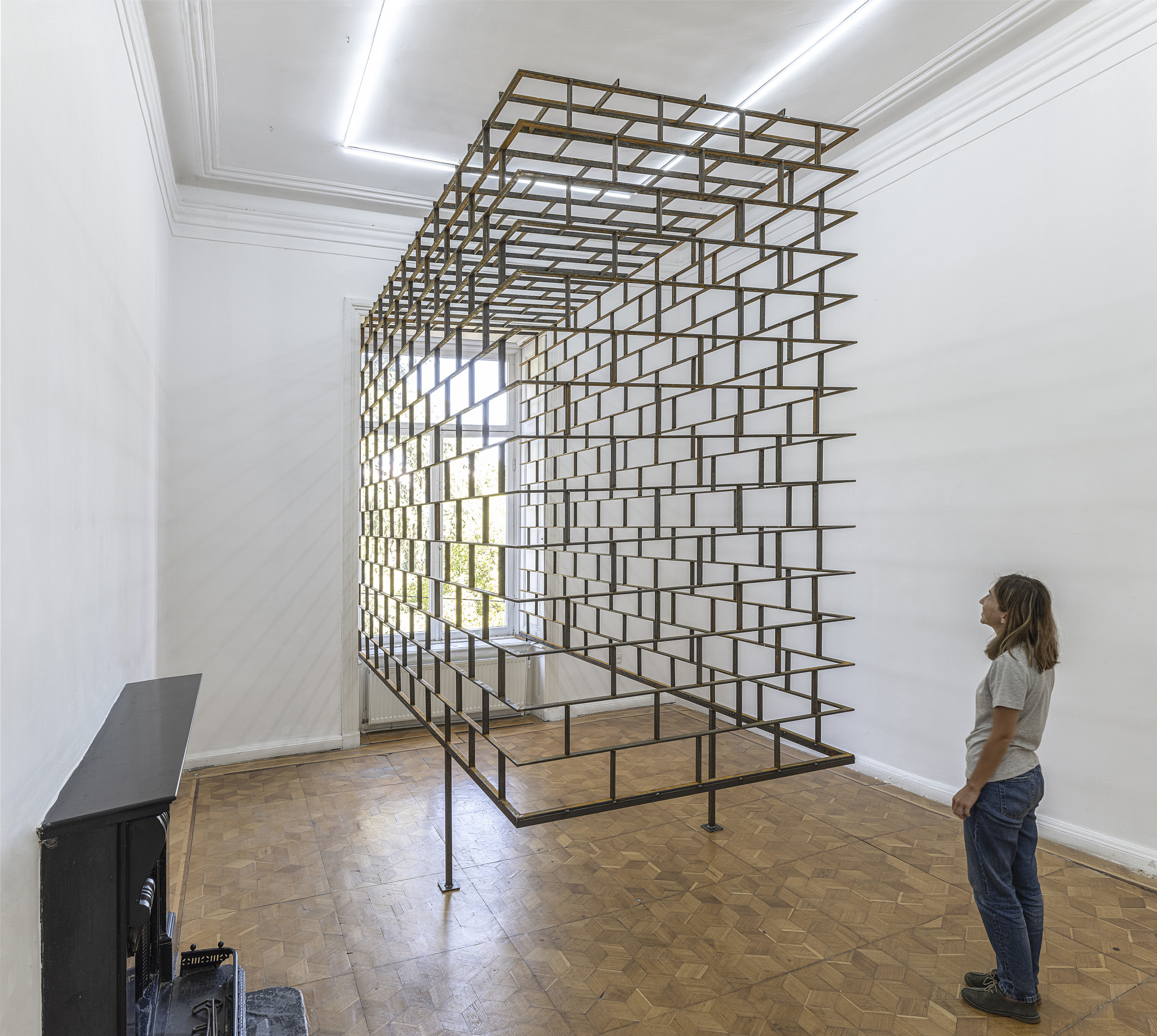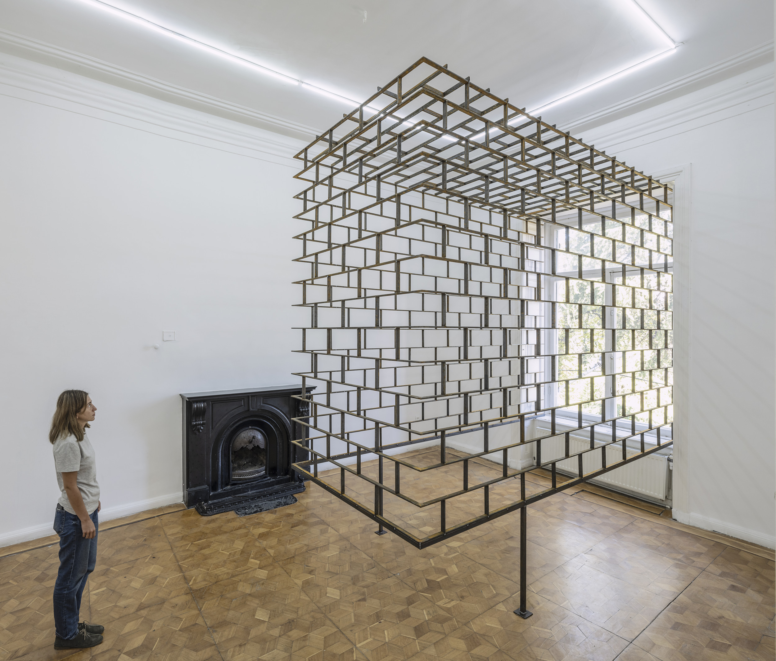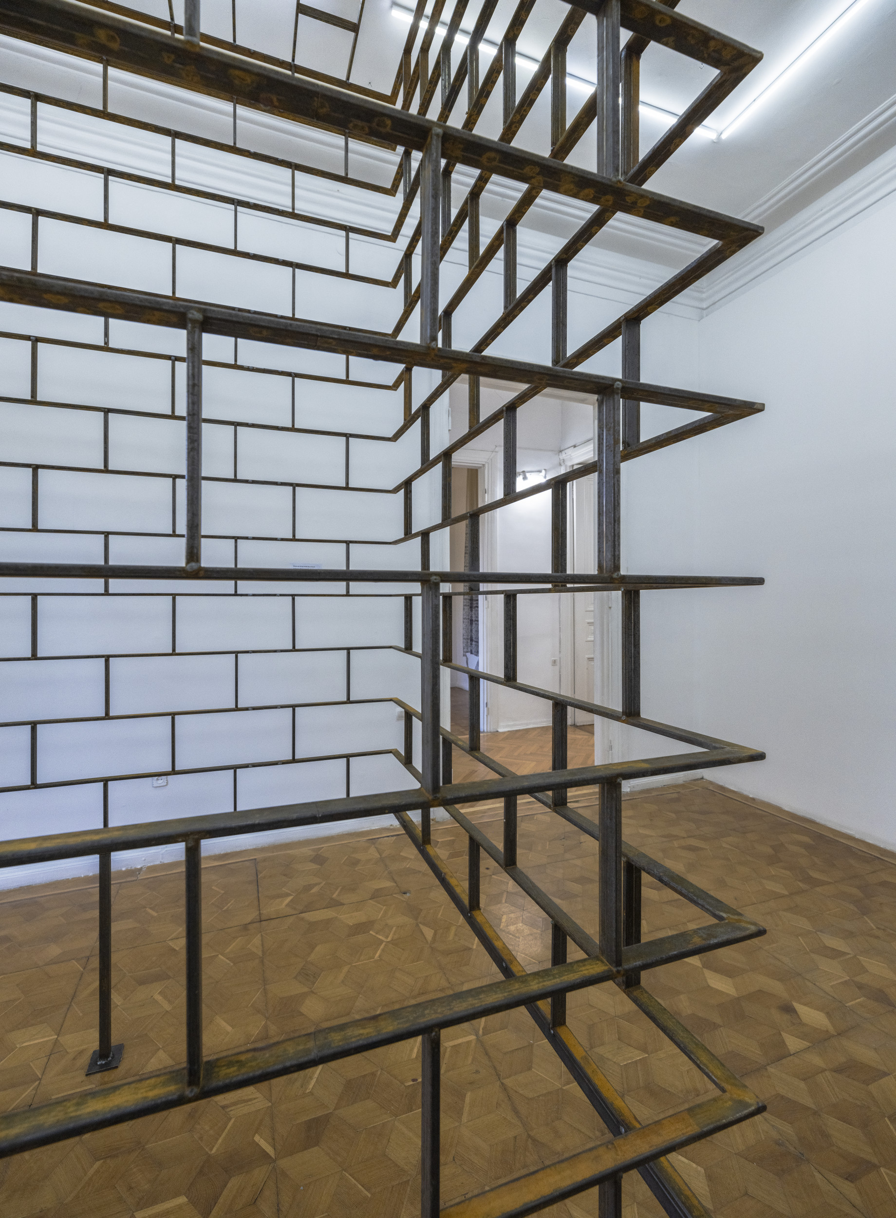 Die jetzige Installation umschließt ein ganzes Fenster und bringt die Form der Fensteröffnung als langgestrecktes Gitter in den Raum hinein. Die invertierte Form, die ähnlich einem eingezogenen Organ in den Körper, einen Raum im Raum bildet, ruft ein unwiderstehliches Gefühl von Paradoxie und Introspektion hervor.