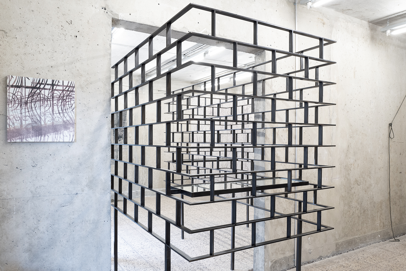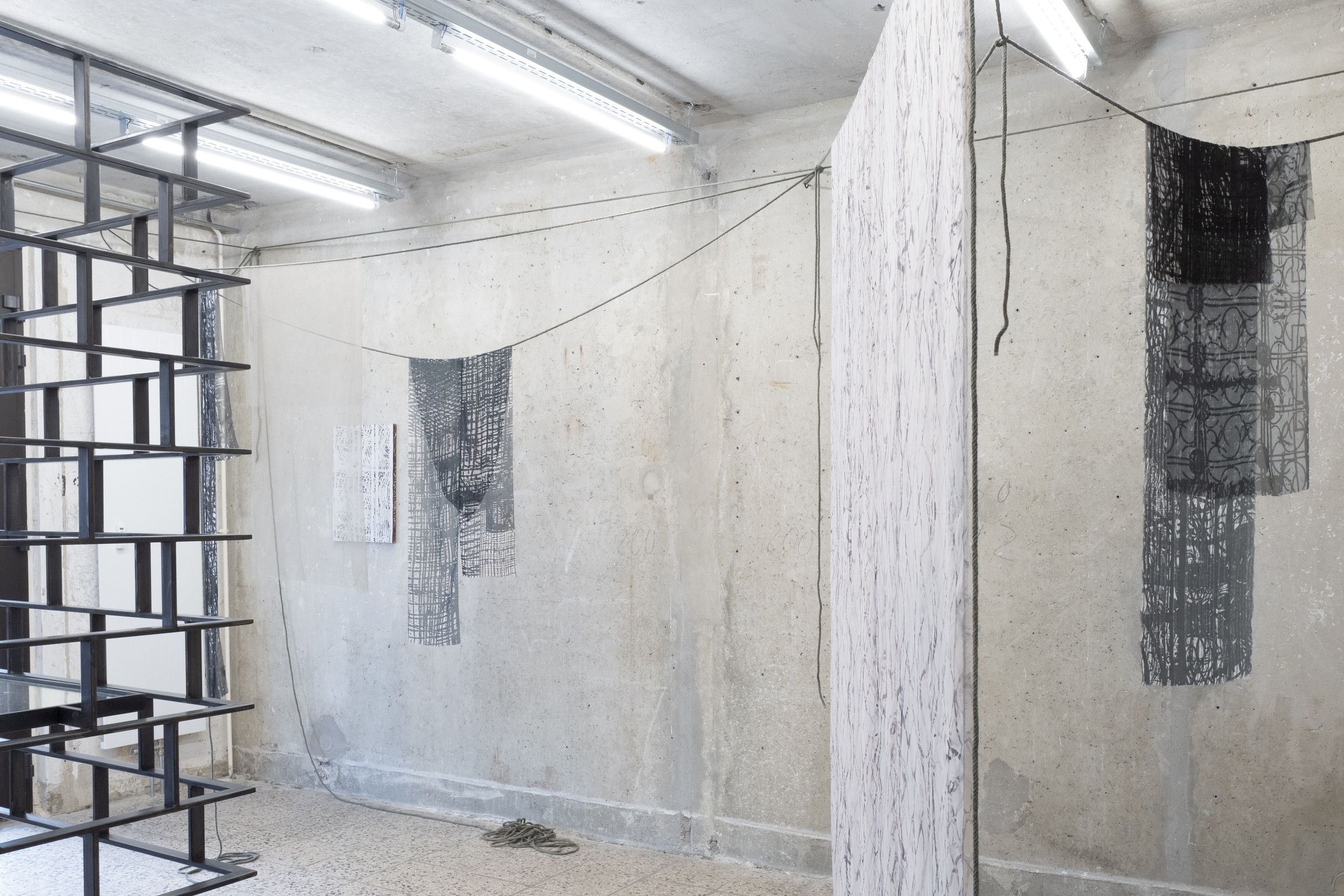 Gemeinsam erforschen sie wie persönliche und kollektive Perspektiven sich im Raum manifestieren und diesen formen sowie die Machbarkeit und Fragilität gesellschaftlicher Teilhabe. Die ortsspezifischen Arbeiten aus Seilen, Textilien und durchlässigen Metallstrukturen interagieren miteinander; Schichten der Beobachtung und Erinnerung der Künstler entfalten sich allmählich - fragmentierte Elemente fügen sich assoziativ wieder zusammen und werden plötzlich greifbar, während man durch die Installationen geht.