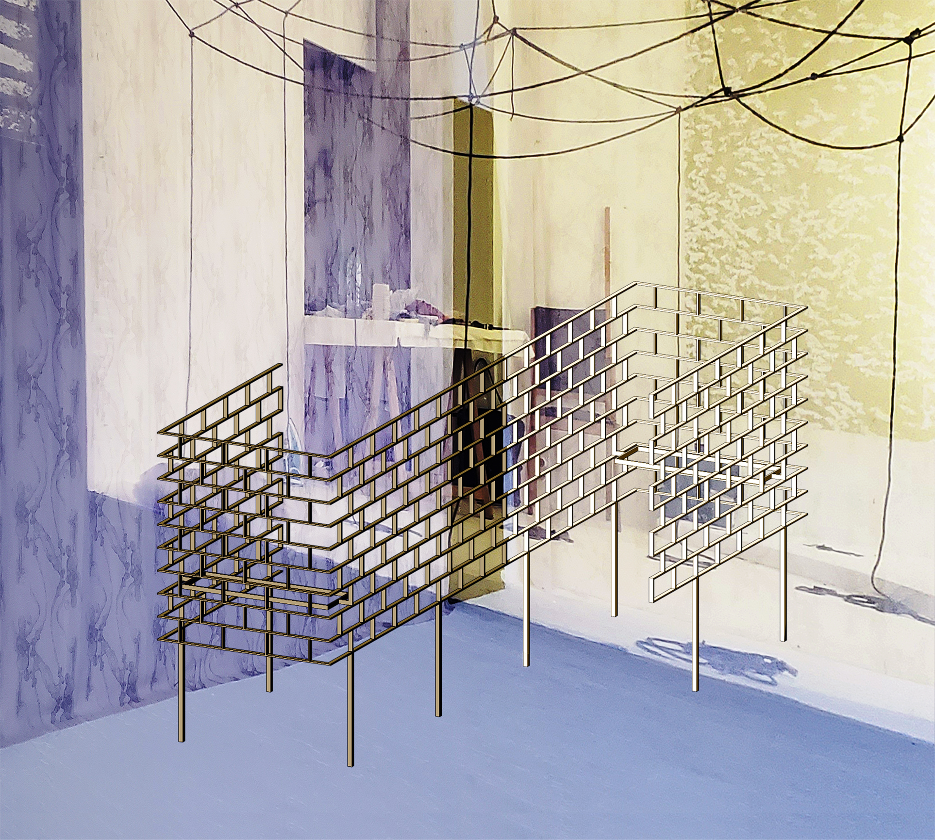 Die Bilder sind von den verschiedenen architektonischen Elementen des Stadtbildes von Tiflis inspiriert. Die Arbeit wird zu einem Prozess des Aufspürens und Übertragens von ähnlichen Geometrien und spezifischen Erinnerungen von einem Raum in einen anderen - einem Dialog, der verschiedene Umgebungen und Kontexte einbezieht. Von der Mitte der Decke herabhängende Stoffschichten verunklaren die Sicht; sie laden den Betrachter ein, sich auf eine fragmentierte Weise mit dem Raum auseinanderzusetzen. Jede Komponente vermittelt ein Gefühl der Zeitlichkeit und Fragilität, versucht aber gleichzeitig, sich im Raum zu verankern und einzuschreiben.