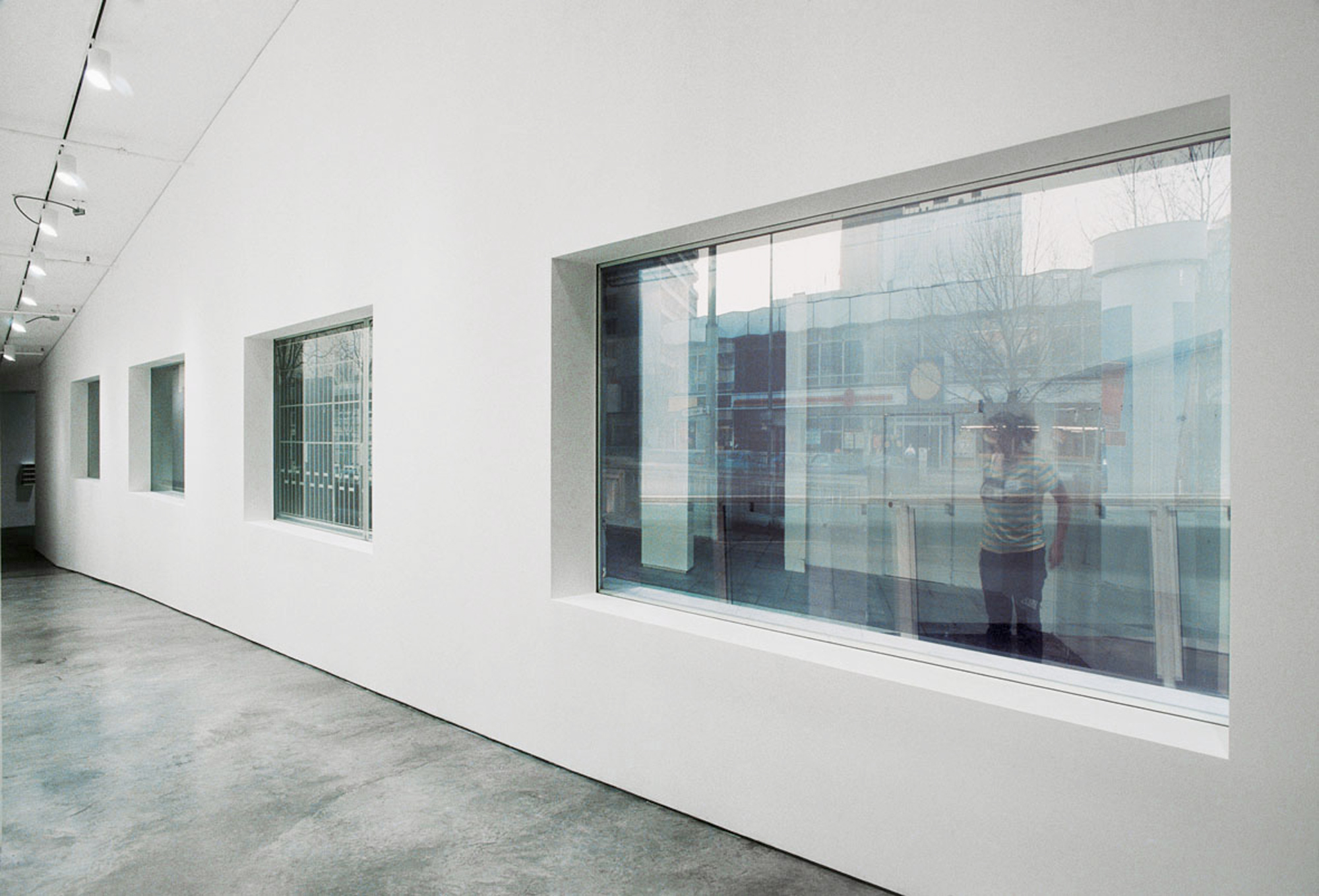 Installation mit 4 transparenten Fotos von leeren Schaufenstern, die zwischen zwei Glasscheiben in eine Wand eingebaut sind. Die Wand teilt mittig den Raum, so dass die Bilder von beiden Seiten aus zu sehen sind, der Raum dahinter wirkt wie eine Spiegelung des Raumes davor. Der Blick geht beim Betrachten der Bilder aber auch durch das Fenster-Bild hindurch in den dahinterliegenden Raum, der das transparente Bild erst hervorbringt. Er überlagert sich mit dem Bild und auch mit Personen, die dasselbe Bild von der anderen Seite aus betrachten.