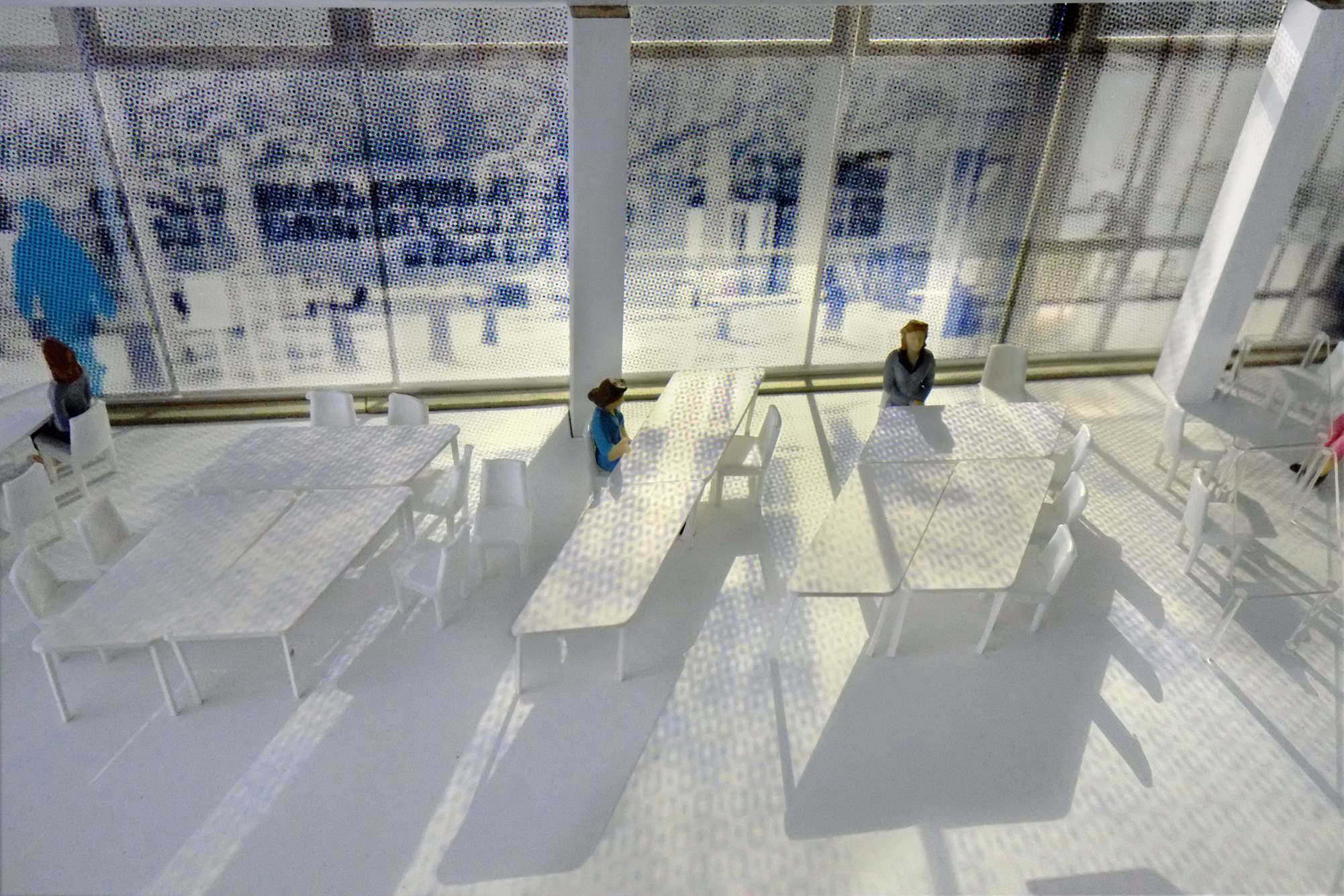 Inside, white parallelogram-shaped tables and round coloured glass tables will accommodate the overlapping views and the play of light and colour of the facade. The tables are mirrored: there are left- and right-angled tables that can be arranged as a group but not mixed.