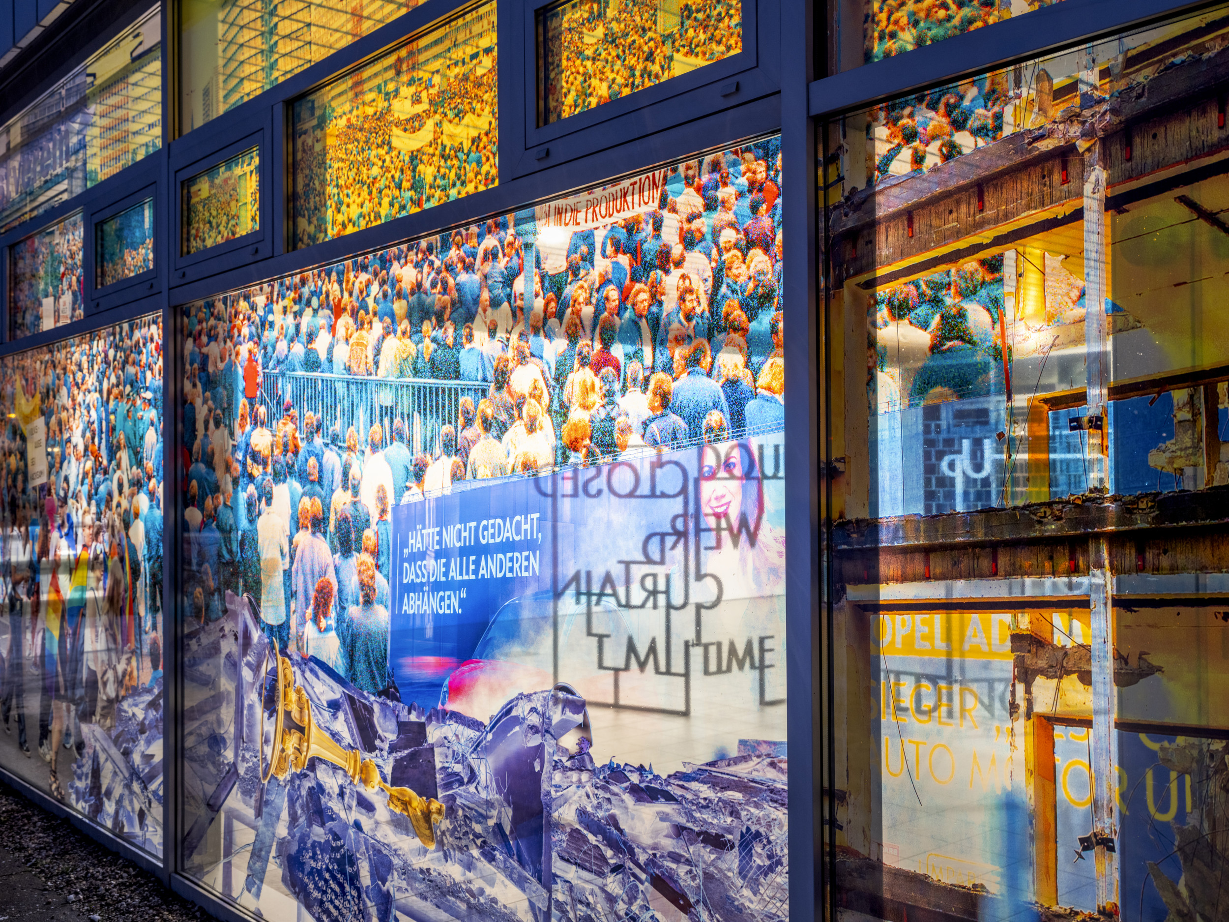 and the history of architecture. In Potsdam, Hornigs work fills the entire façade of the Late Modernist glass pavilion built in 1973. Her installation transforms the panes of the pavilion into an extensive series of images in which scenes of demonstrations, façades of industrialized residential buildings from the time of this building’s construction, and functional architectures from the history of German democracy are melded. Segments of Baroque and Neoclassical Potsdam stand in stark contrast to that, as if the demonstrating sovereign had to reposition itself in an unleashed patchwork of nostalgia and utopia, rationally designed equality and theatrical pathos.