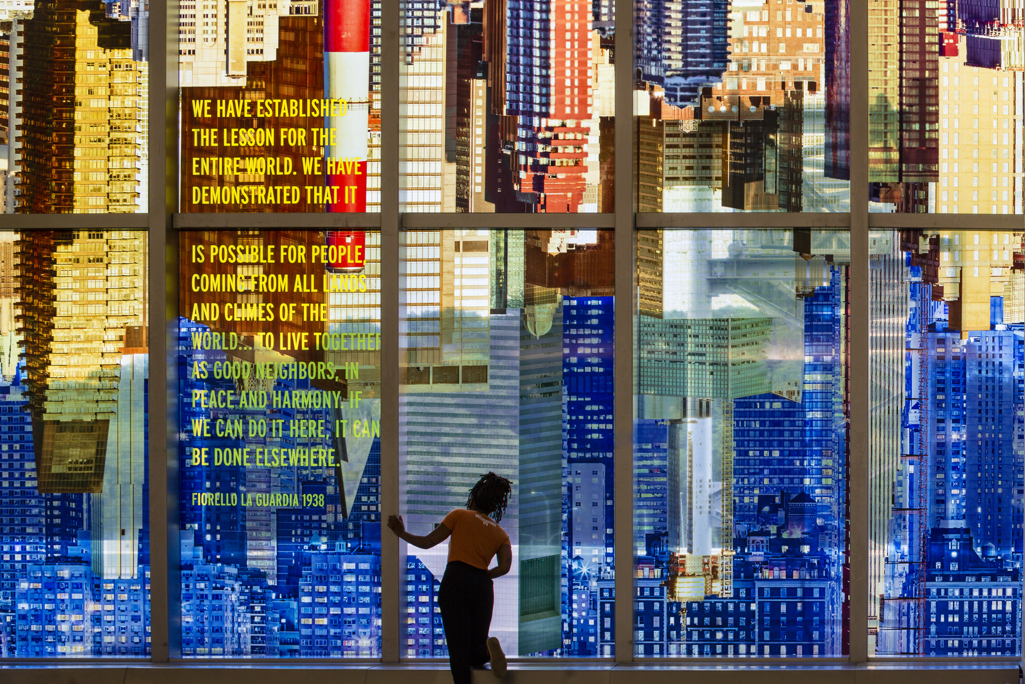 The work brings together the New York skyline and textual elements, weaving fragments from the speeches and writings of