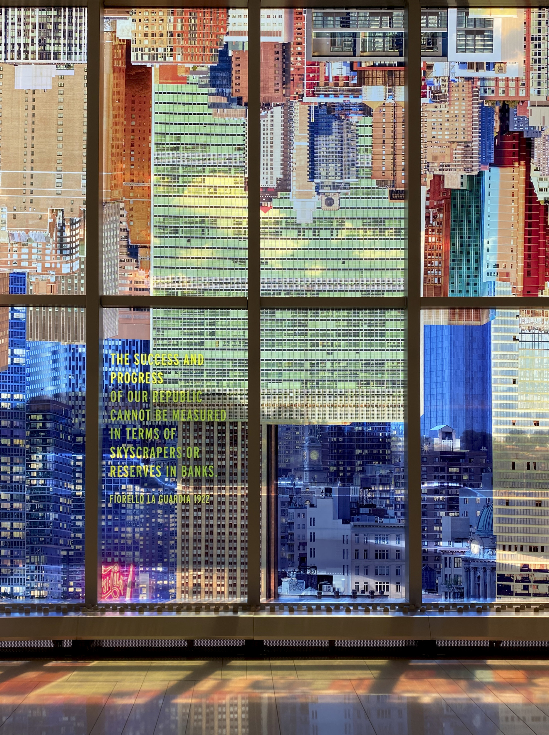 La Guardia Vistas is a large photographic artwork on glass, in which passages of text are incorporated. It is installed on the window of the pedestrian connector bridge of LaGuardia Airport’s new Terminal B, and depicts a dramatic invented image of an inverted New York City skyline washing the connector with color, image and text.