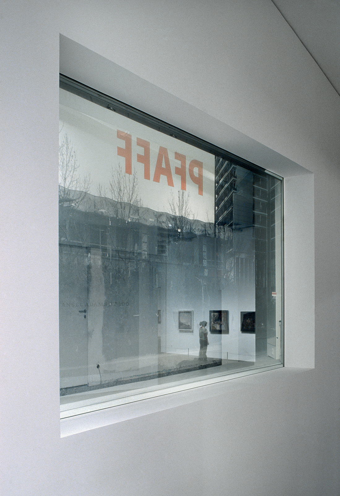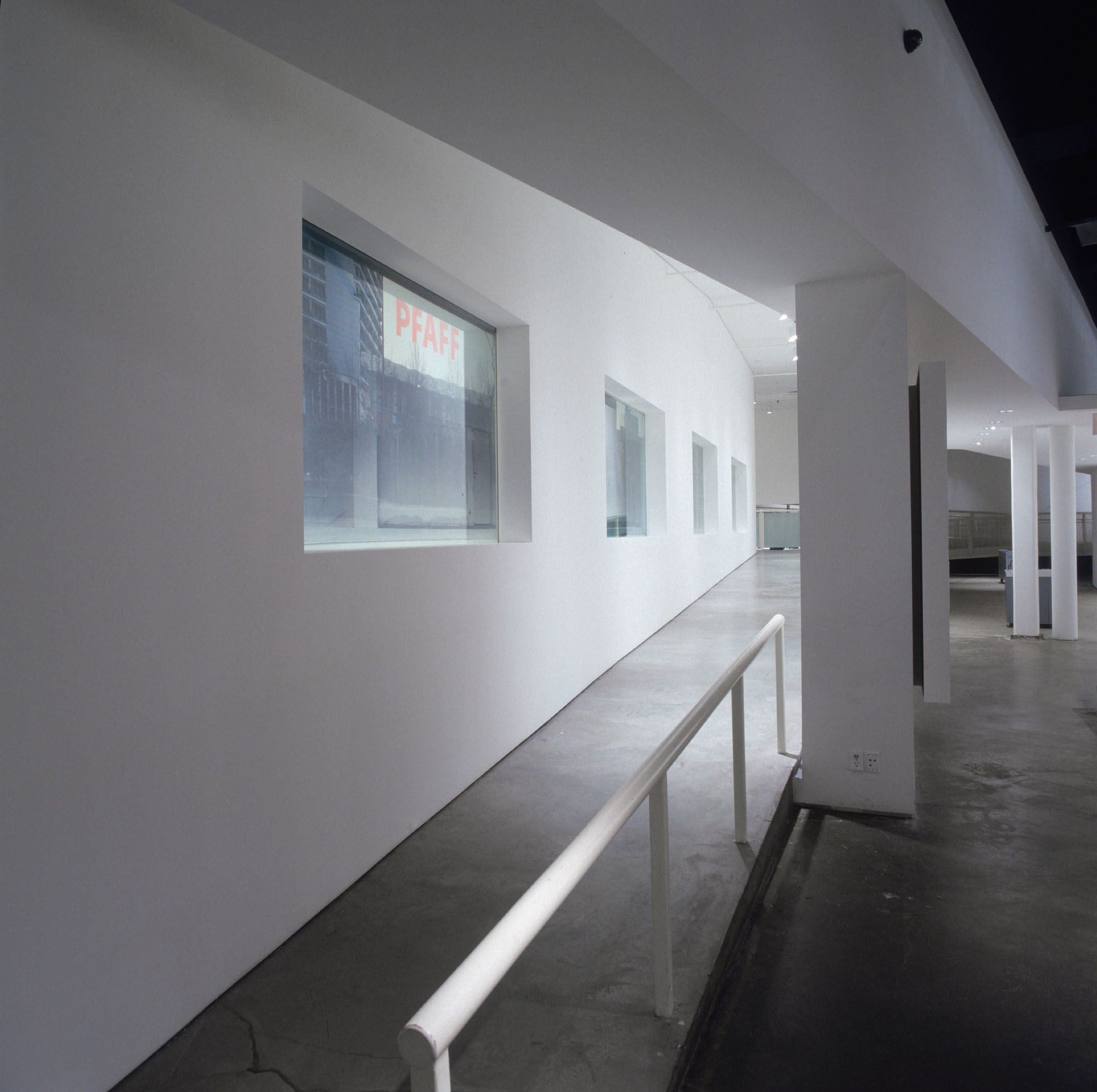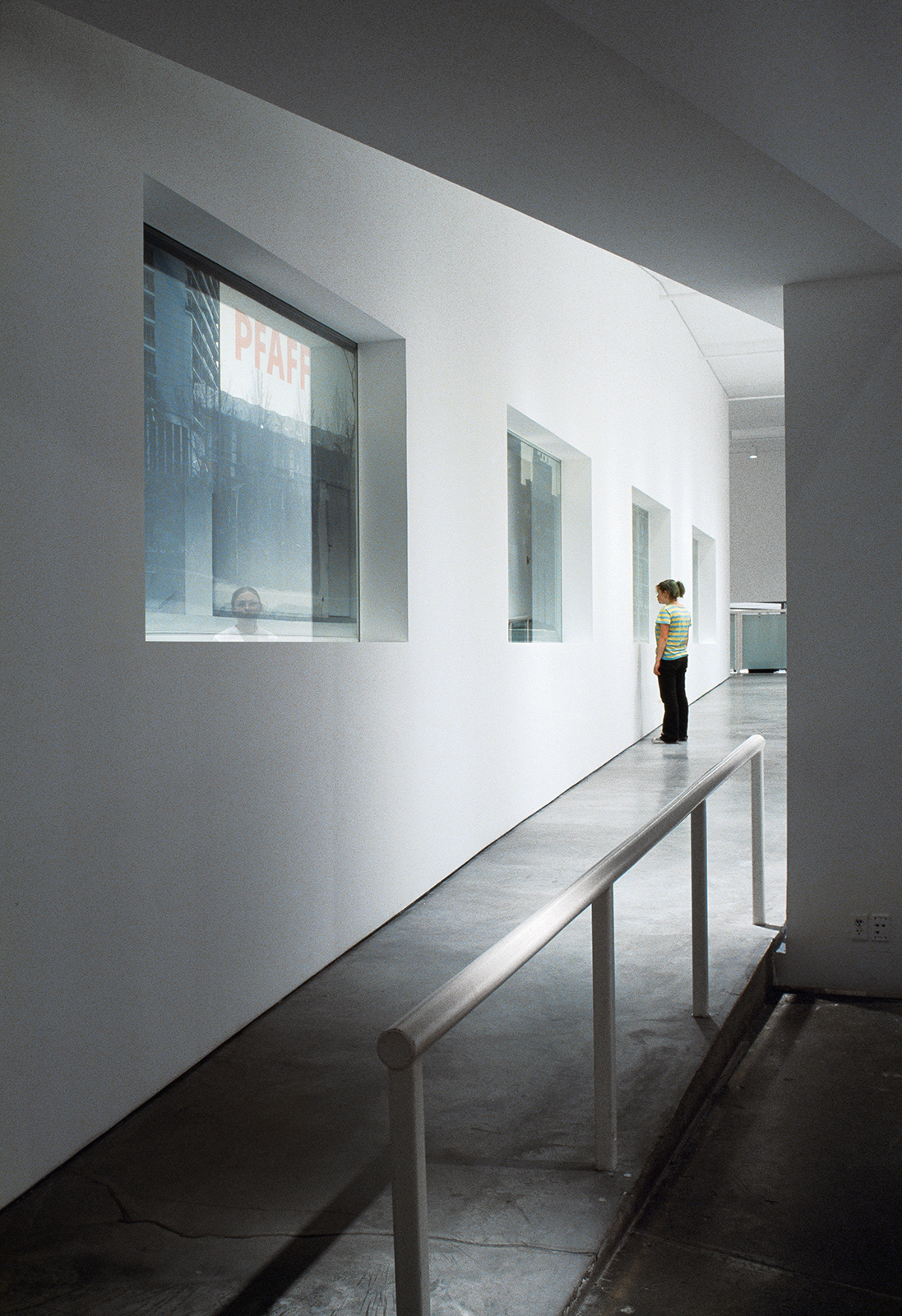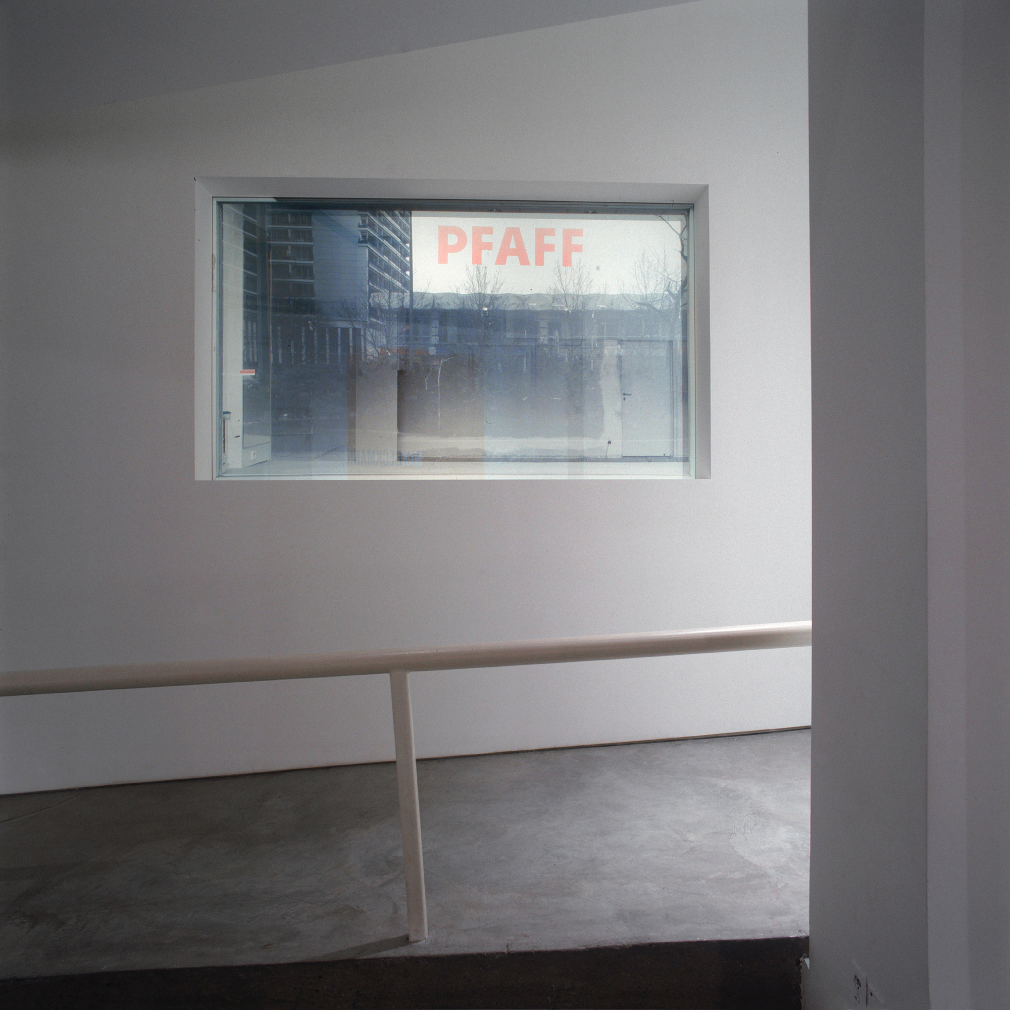 Installation involving 4 transparent photographs of empty display windows, mounted between two sheets of glass and built into a wall that bisects a space at its centre. This allows the images to be viewed from both sides; the room at the back seems like a reflection of the one in front. When looking at the images, the gaze also penetrates the room behind that is required to create the transparent image in the first place. The view of the space becomes superimposed with the photographic image and also with visitors who are looking at the same image from the other side.