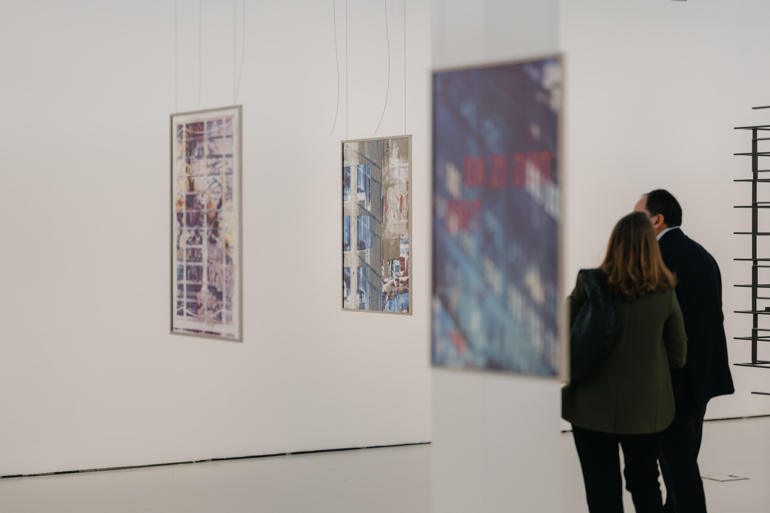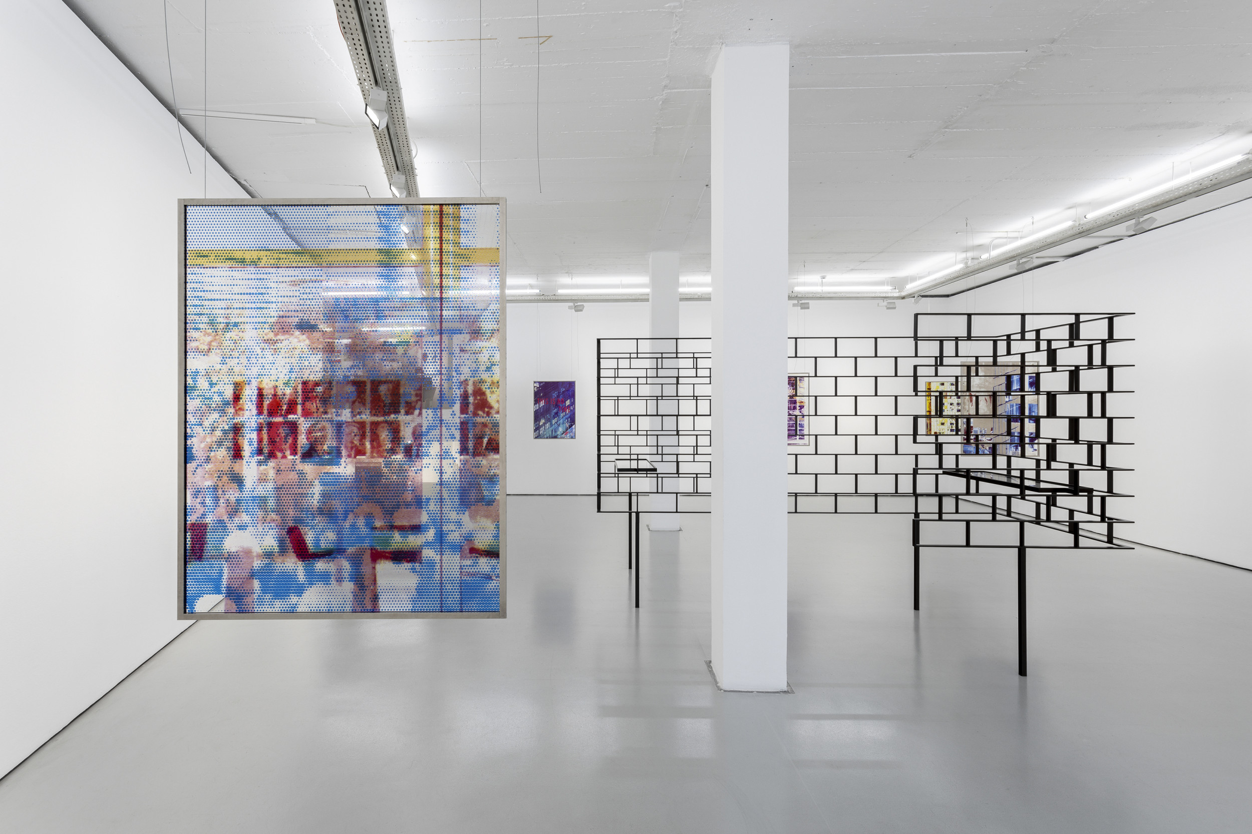 In another set of works, sheets of glass are suspended mid-air, suggesting windows within invisible walls that subtly divide the gallery. These glass pieces feature compositions rendered in ceramic paint, which glow in fragmented patterns, resembling coded reflections of unseen environments. Found graffiti elements intertwined with iconic imagery, including a photograph of the 1989 East Berlin demonstrations that precipitated the fall of the Berlin Wall, and fragmented urban elements from Berlin, Tbilisi and New York. These layered, translucent surfaces evoke fleeting associations, inviting visitors to explore ever-shifting perspectives.
