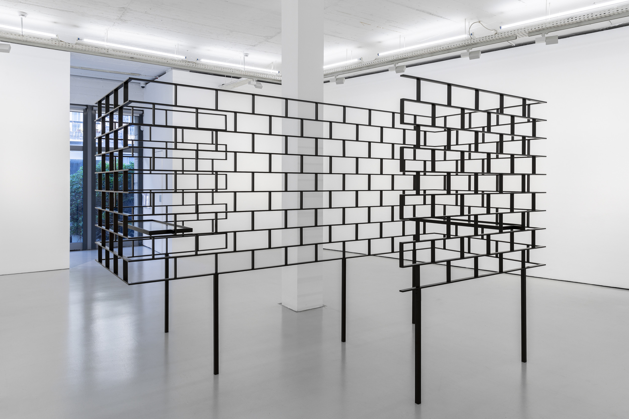 The centerpiece, Wahlkabine (Voting Booth), consists of a metal structure forming two identical, adjoining rooms. These spaces can only be entered sequentially from opposite directions or observed simultaneously through the permeable walls, with one room serving as the inverse of the other. Each room features a small table, akin to a voting booth, while the transparent walls paradoxically negate the concept of privacy. This installation interrogates the uncanny simultaneity of interior and exterior perceptions and destabilizes once-solid certainties. It evokes the disorienting experience of confronting societal paradigms that are suddenly reversed, echoing an Orwellian dilemma. The metal framework, constructed solely from brick-patterned joints, underscores the tension between opposites and their seamless permeability.