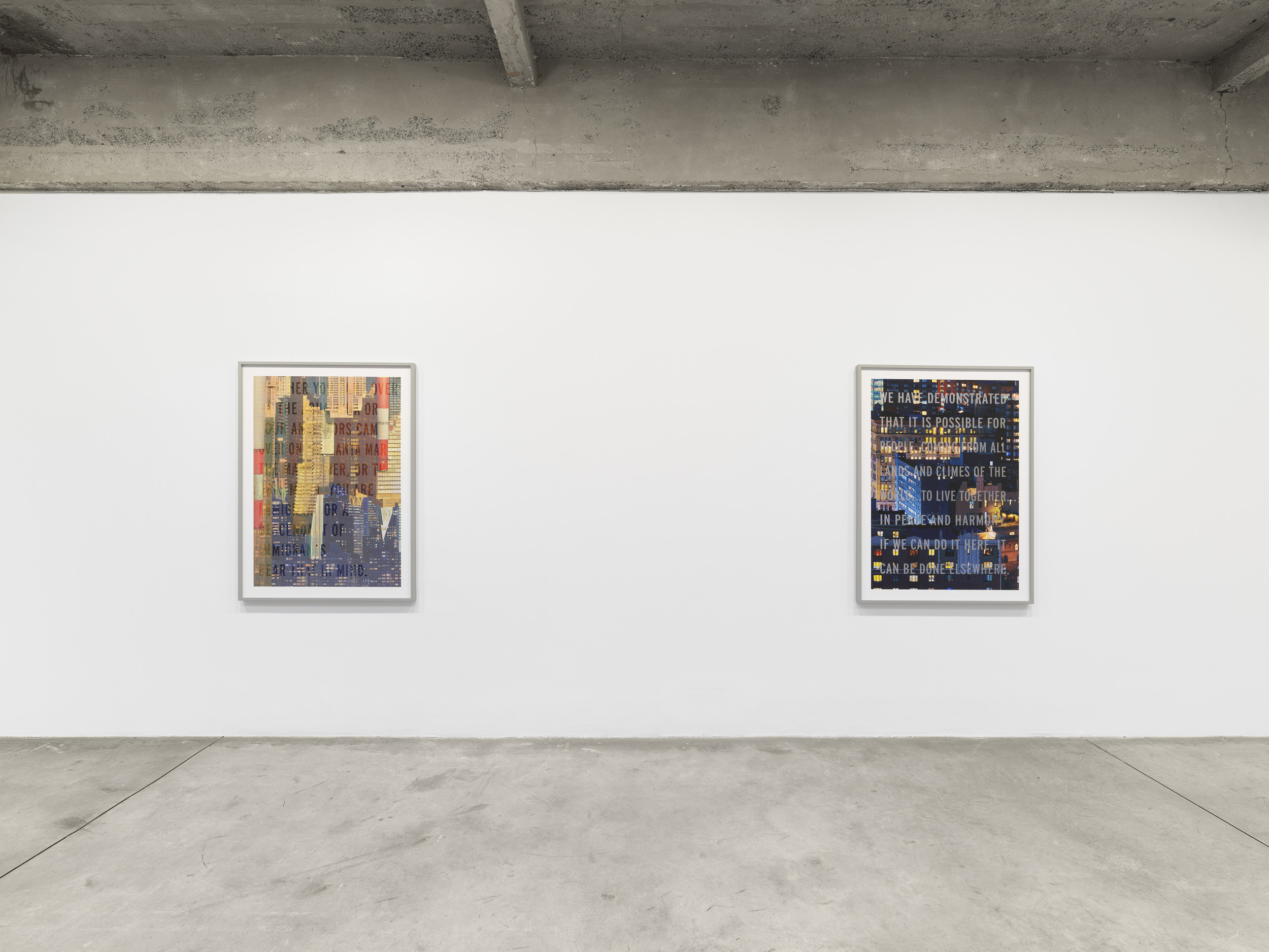 While reflecting on New York, Hornig was inspired by the 1939 World’s Fair (Your World of Tomorrow), which fostered building projects that championed democratic ideals and modernity at a time when Europe was backsliding into nationalistic dictatorships and war. Hornig combines intricate details from contemporary images of the cityscape with Mayor Fiorello La Guardia’s iconic phrases from this period to speak to critical themes in civil society that are timelessly present. Resembling political posters, the works transcend time via layers of the city’s architecture.