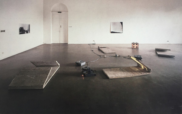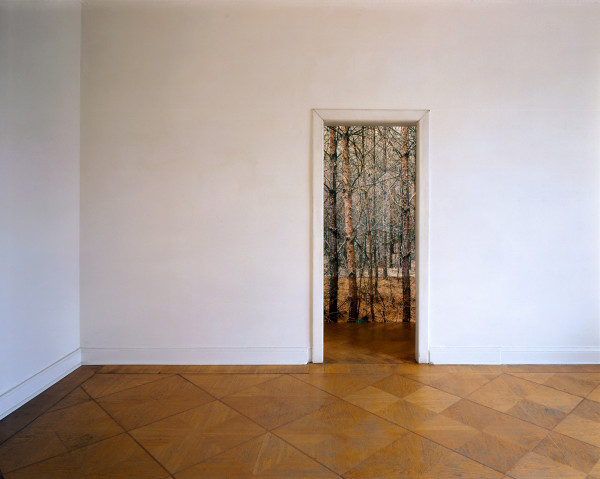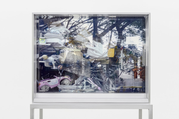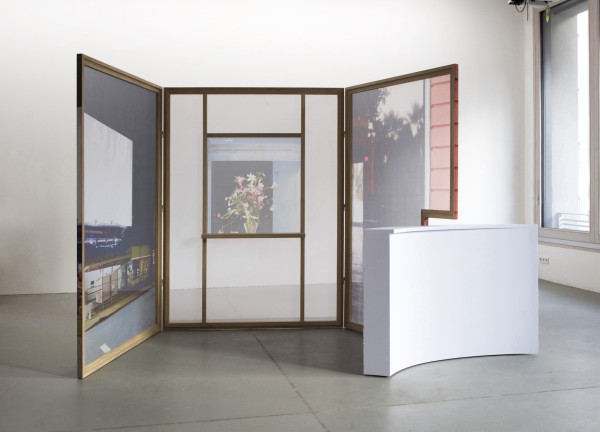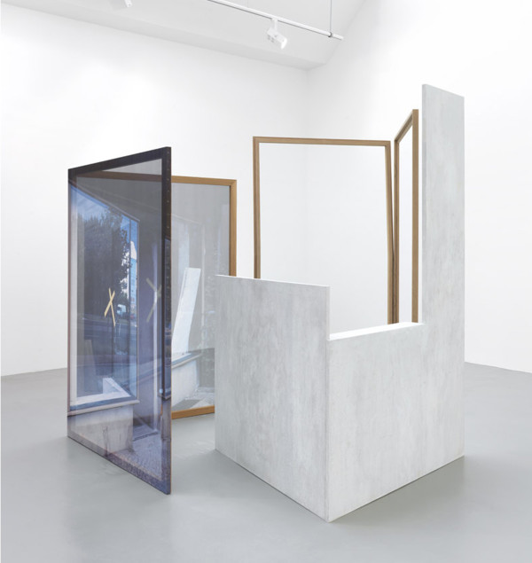 Großes Eckfenster, 2012, Aluminium, wood, sublimation print on polyester, concrete, 213 x 163 x 280 cm und 80 x 30 x 35 cm