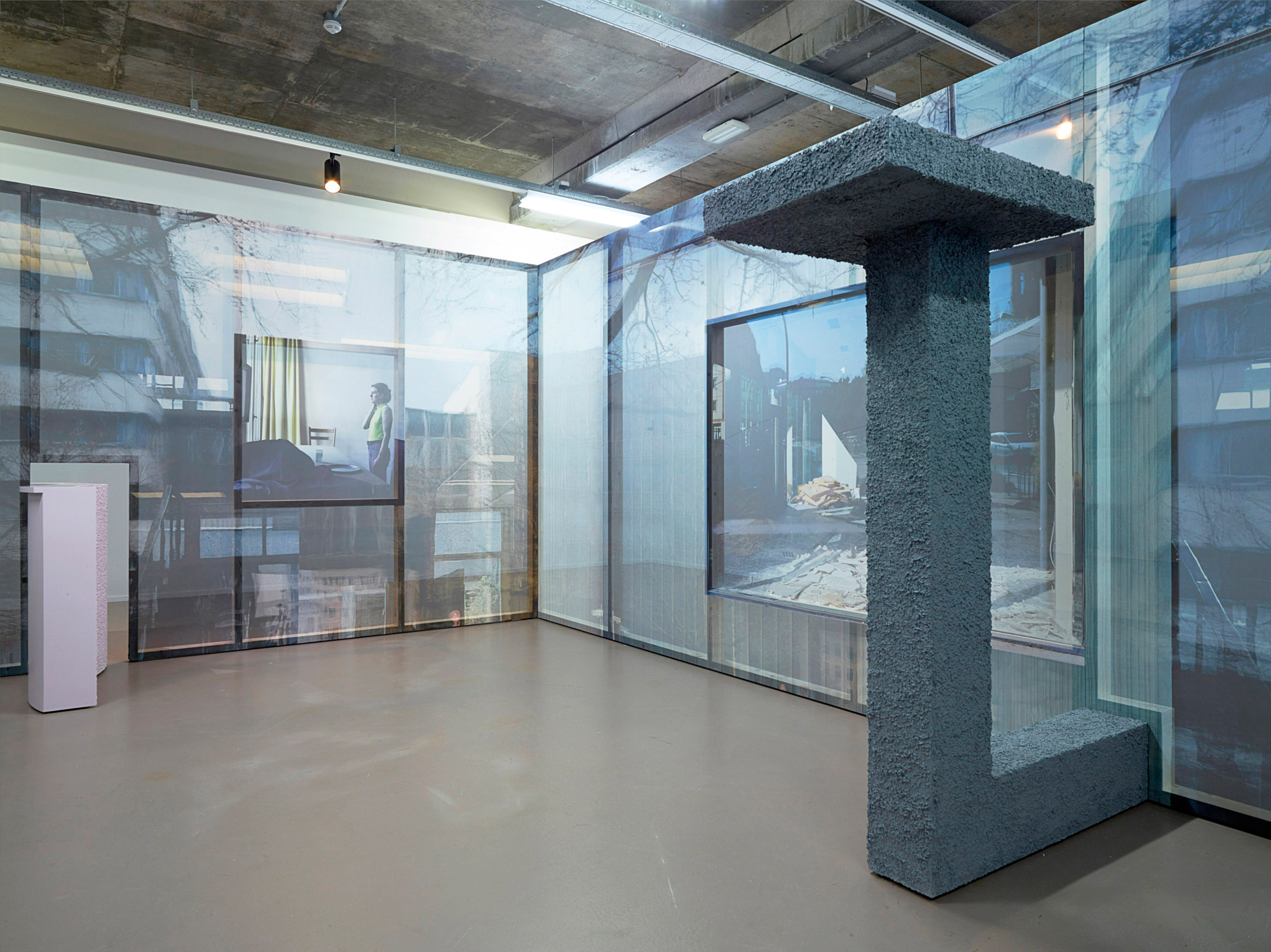 Die drei Skulpturen, fragmentarisch geschwungene Fensterbänke und Podeste mit grob verputzten Oberflächen, suggerieren sowohl Innenwände als auch verputzte Außenfassaden. Diese fortlaufende Umkehrung gleicht den Innen- und den Außenraum einander an und setzt der Erfahrung der Allmacht labyrinthischer Gleichzeitigkeit die gebauten Stopper als taktile Konfrontation entgegen.