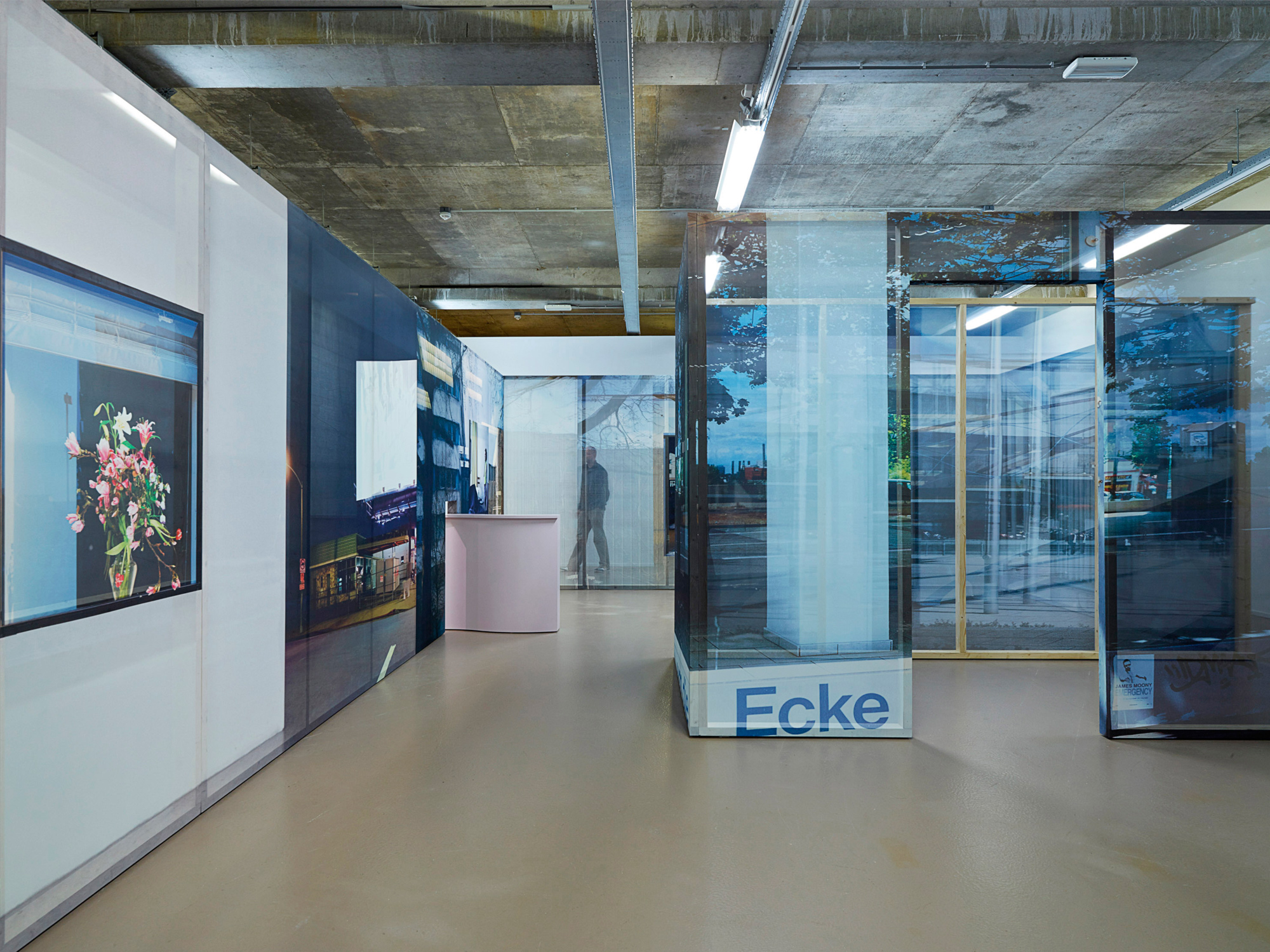 Dem Grundriss nach könnte es sich um eine moderne Wohnung handeln, die gerade gebaut wird, oder um einen Glaspavillon. Die zart bedruckten Flächen erscheinen wie flüchtige Spiegelungen auf Glas. Doch hier gibt es kein Glas, tatsächlich zu sehen sind gedruckte Reflexionen.