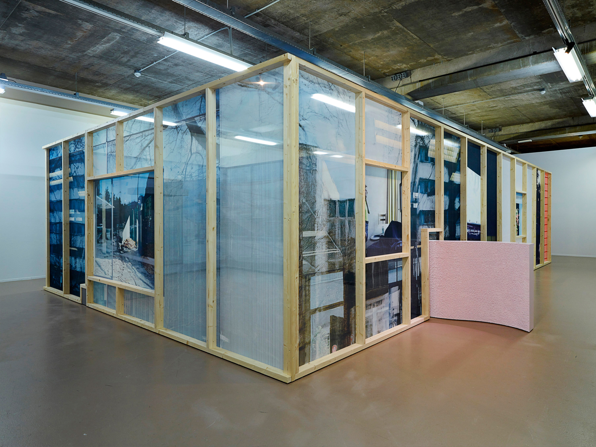Double Transparency ist eine begehbare, frei stehende Struktur. Ihre zwölf Rahmenelemente aus Holzlatten und transparent bedrucktem Textil sind zu einem Gehäuse zusammengesetzt, das einen vollständig transparenten Raum ergibt. Wände, die sonst gebaut worden wären, um Kunstwerke solide zu tragen, sind hier selbst zu durchlässigen Membranen der Information geworden; an drei Stellen sind architektonische Skulpturen platziert, von denen zwei die durchlässigen Wände auf halber Höhe physisch durchdringen und sich auf der jeweils anderen Seite gleich einer Spiegelung fortsetzen.