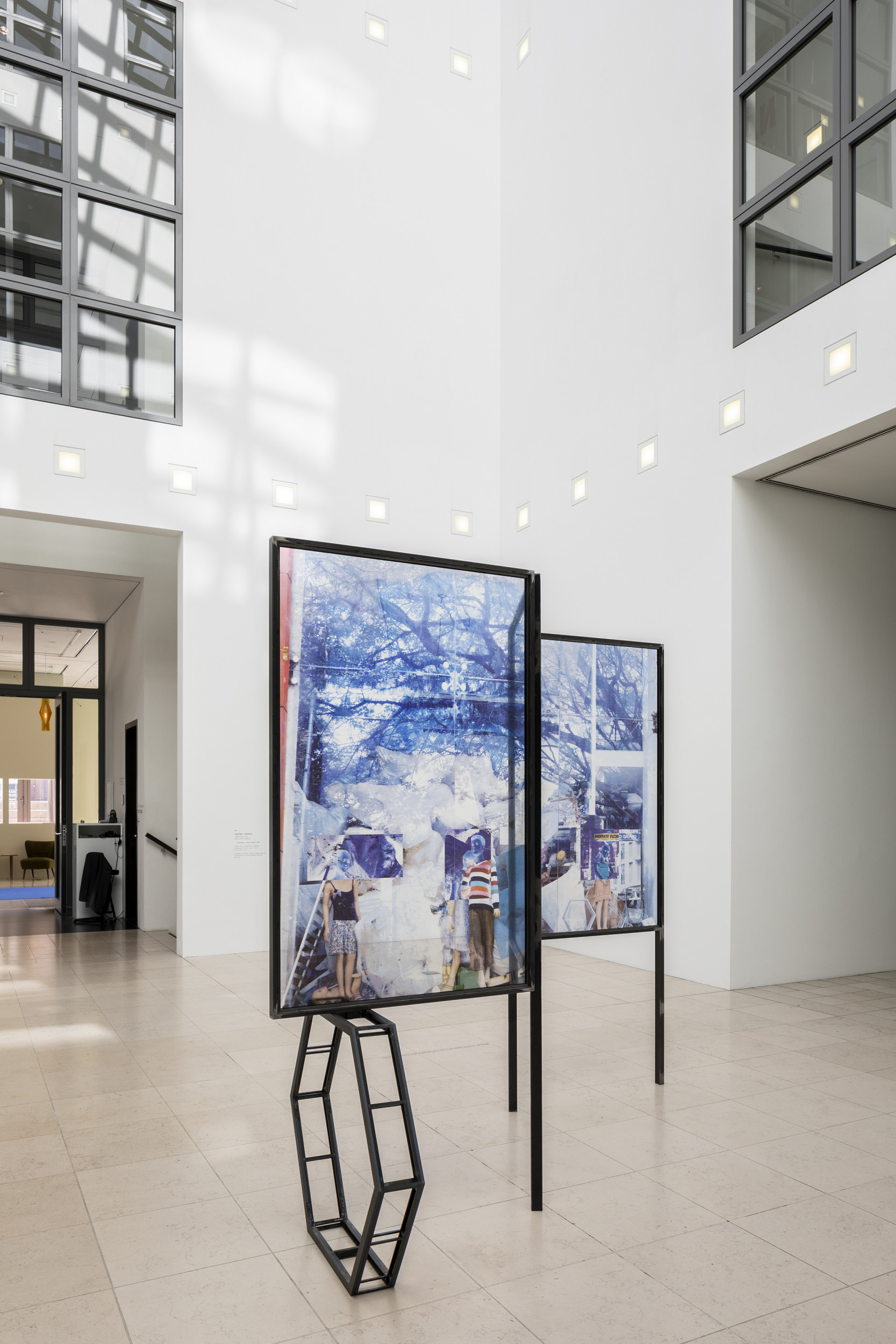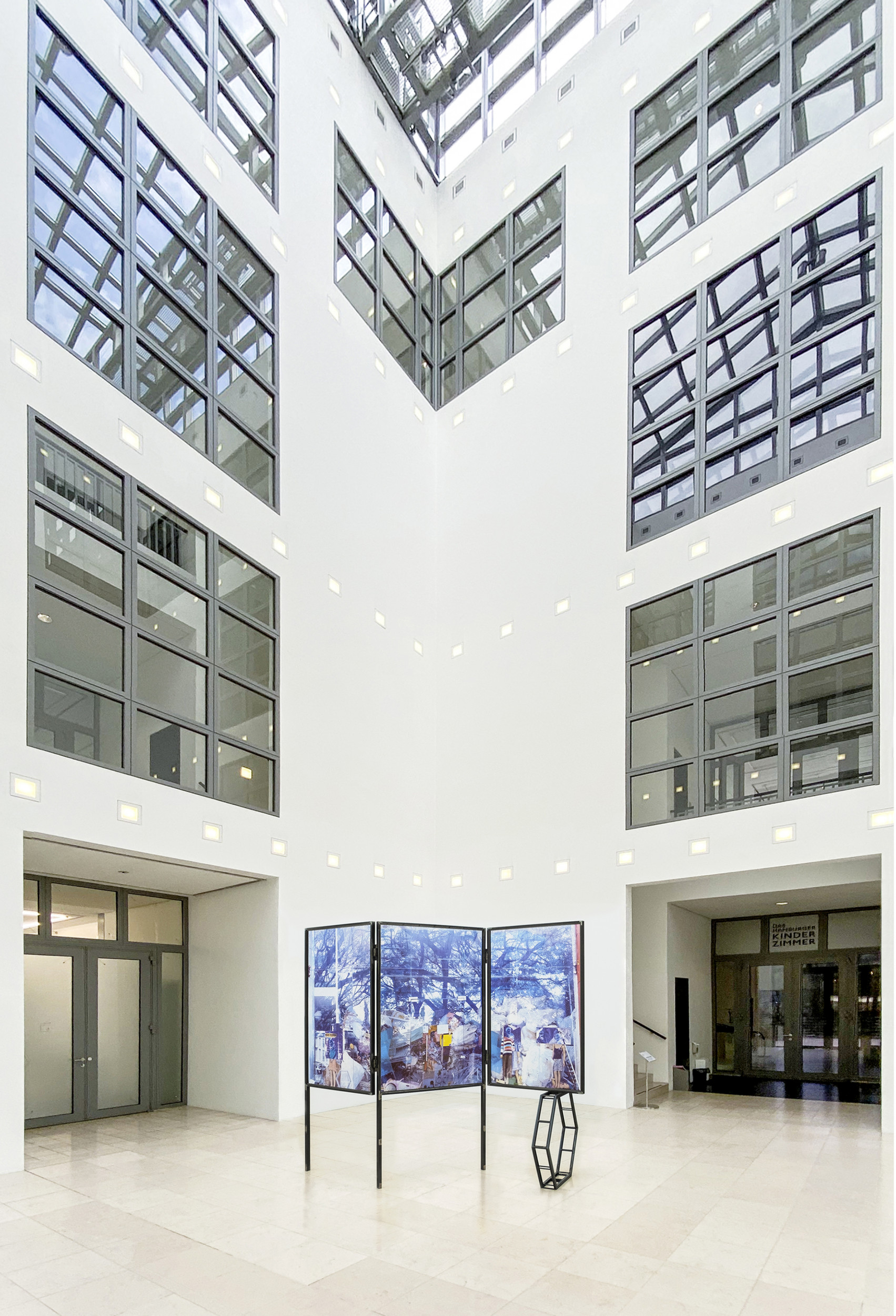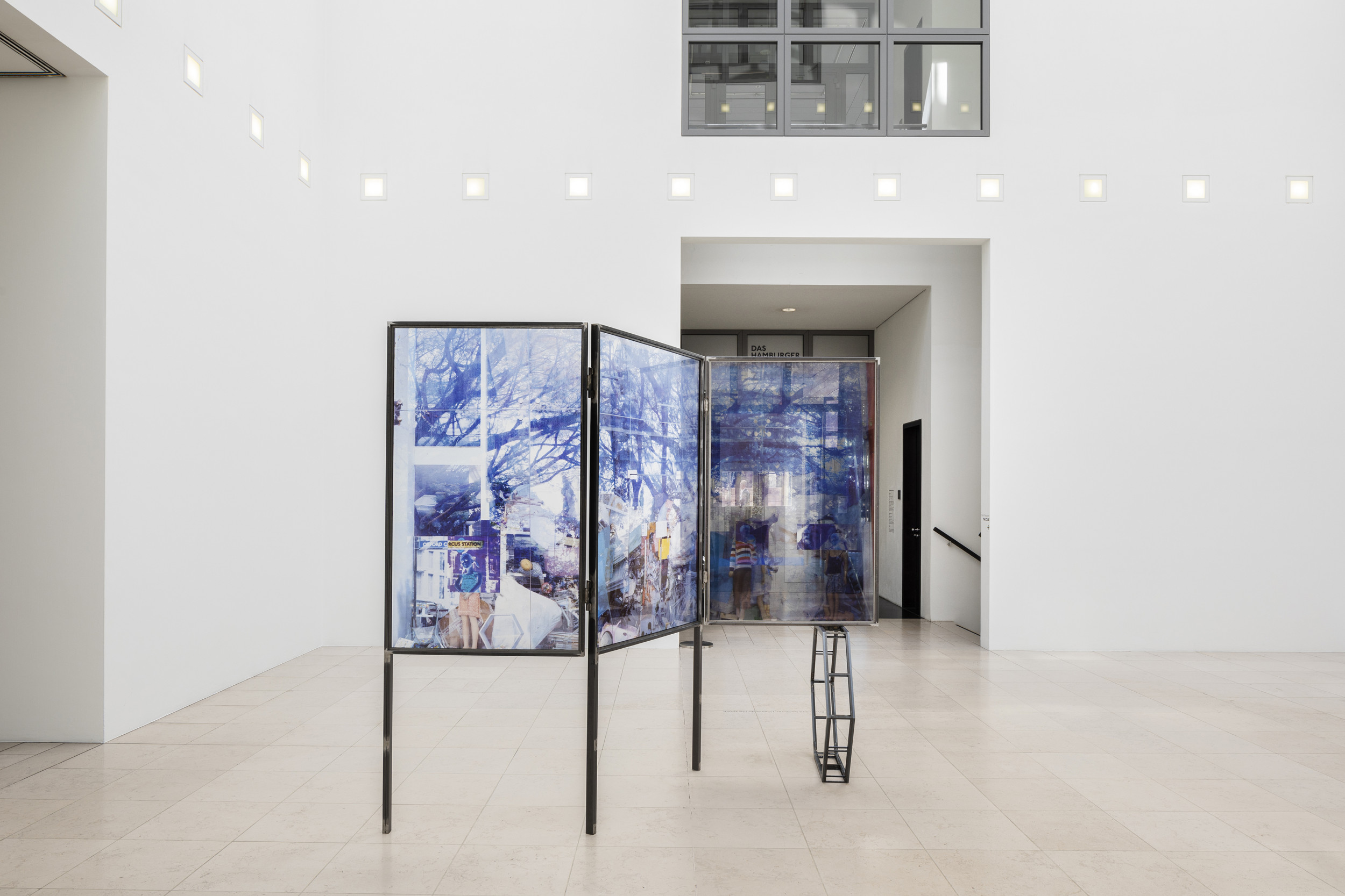 Skulptur, die sich aus drei Glasbildern und einem Hexagon zusammensetzt. Sie steht hier im Lichthof der Hamburger Kunsthalle.