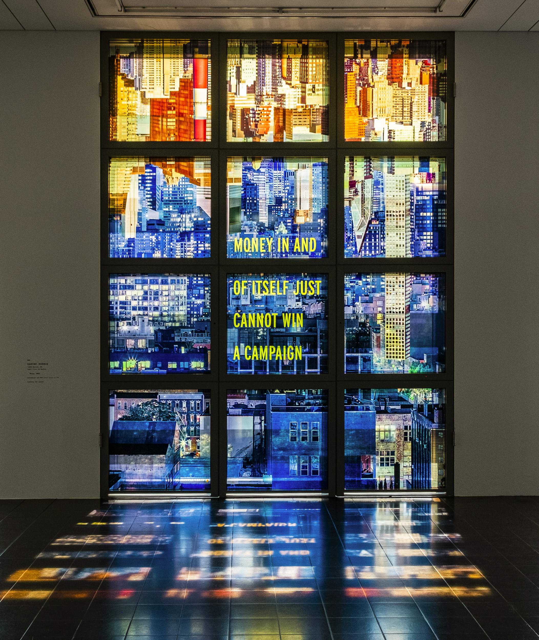 Mit der Technik der Umkehrung arbeitet Sabine Hornig auch in ihrer Arbeit „ Money“ auf dem Südfenster des ersten Stock des Gebäudes. Ausgangspunkt für die Arbeit Money (2022) sind Fotos der Skyline von New York, die im Rahmen eines Projektes „La Guardia Vistas“, 2020, die hier für ein Hamburger Fenster zu einer neuen Komposition zusammengesetzt wurden. Bei Tag aufgenommene golden leuchtende Hochhäuser sind auf den Kopf gekehrt und hängt von oben herab, während eine städtische Nachtansicht sich von unten in die Zwischenräume der umgekehrten Türme schiebt.