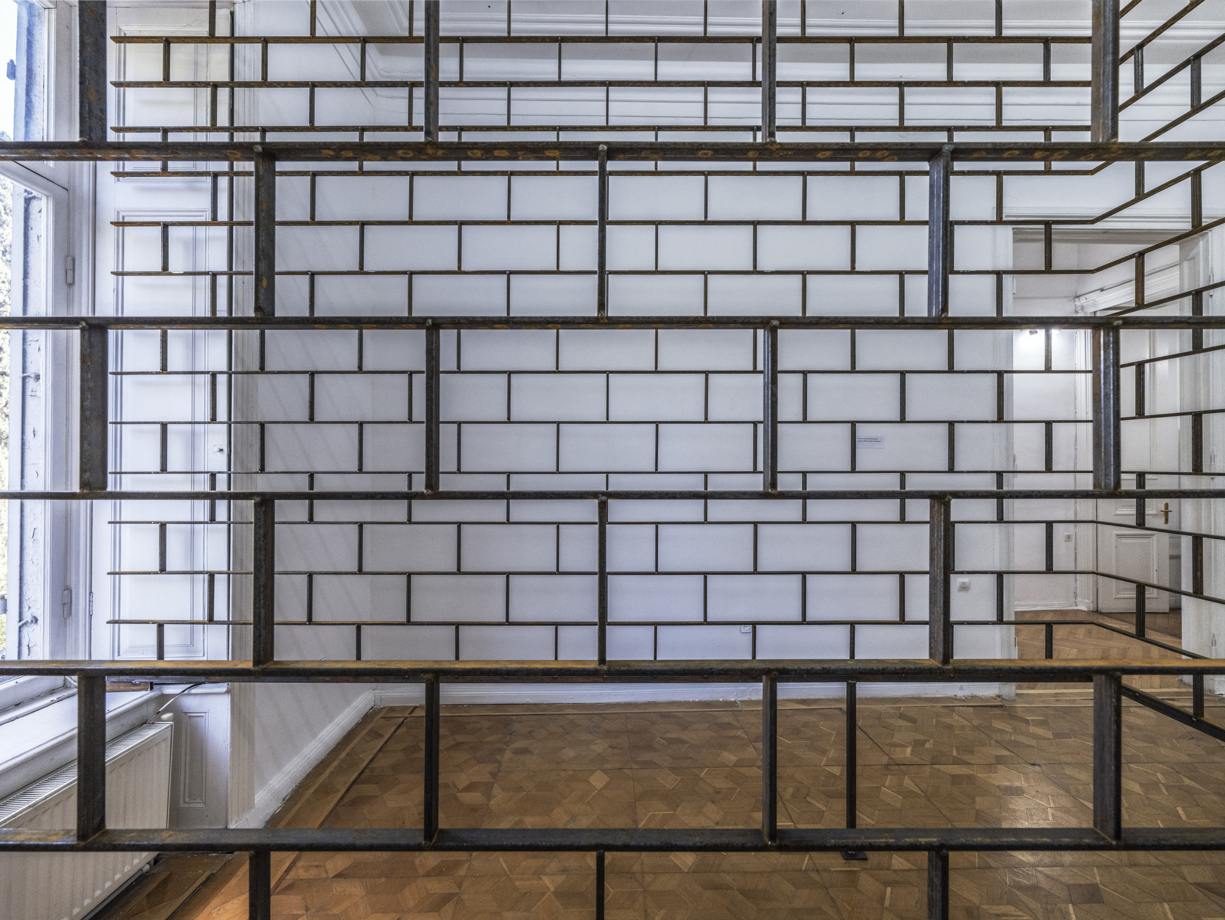 Die jetzige Installation umschließt ein ganzes Fenster und bringt die Form der Fensteröffnung als langgestrecktes Gitter in den Raum hinein. Die invertierte Form, die ähnlich einem eingezogenen Organ in den Körper, einen Raum im Raum bildet, ruft ein unwiderstehliches Gefühl von Paradoxie und Introspektion hervor.