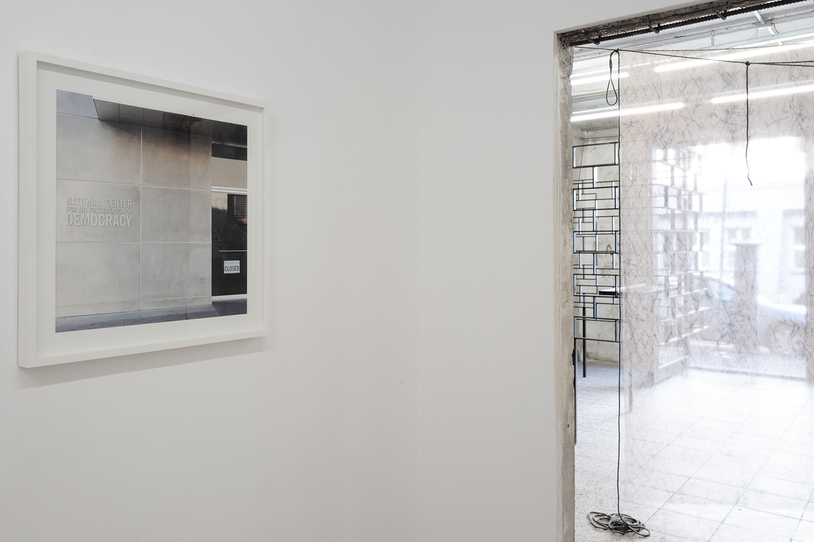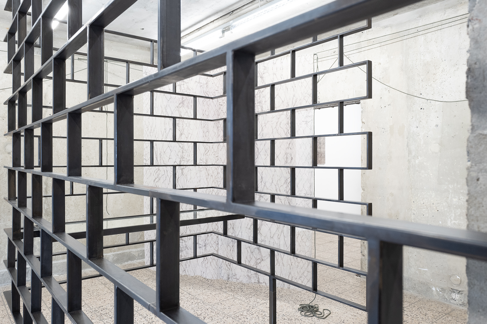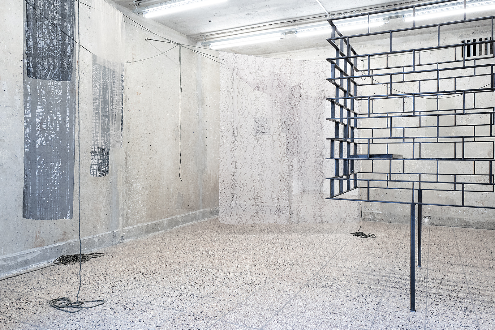 Gemeinsam erforschen sie wie persönliche und kollektive Perspektiven sich im Raum manifestieren und diesen formen sowie die Machbarkeit und Fragilität gesellschaftlicher Teilhabe. Die ortsspezifischen Arbeiten aus Seilen, Textilien und durchlässigen Metallstrukturen interagieren miteinander; Schichten der Beobachtung und Erinnerung der Künstler entfalten sich allmählich - fragmentierte Elemente fügen sich assoziativ wieder zusammen und werden plötzlich greifbar, während man durch die Installationen geht.