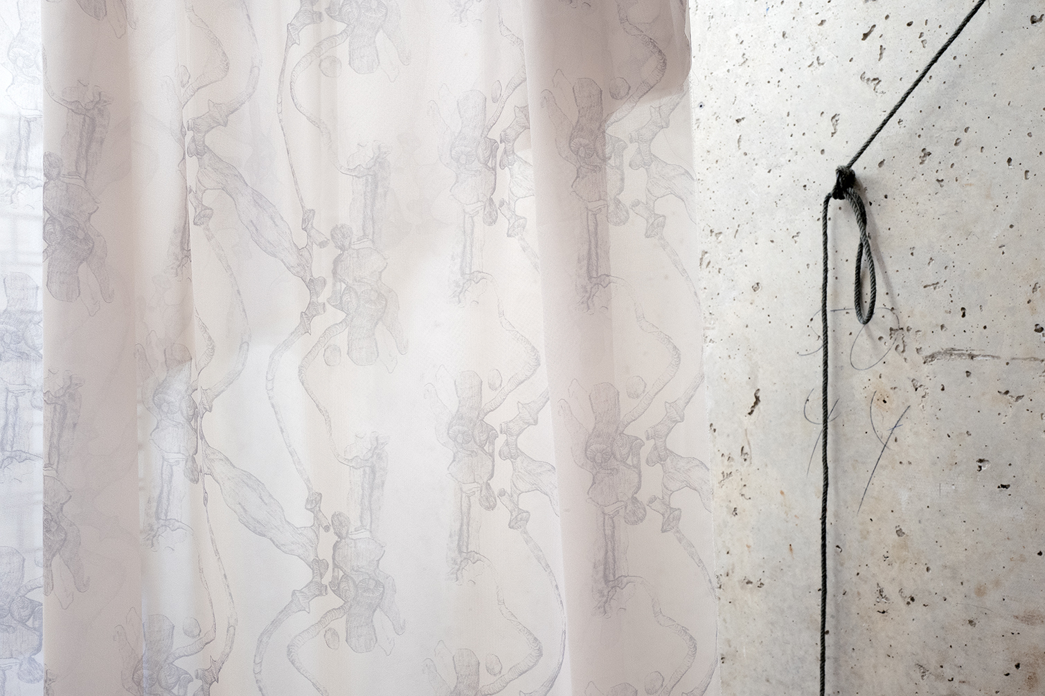 Die Bilder sind von den verschiedenen architektonischen Elementen des Stadtbildes von Tiflis inspiriert. Die Arbeit wird zu einem Prozess des Aufspürens und Übertragens von ähnlichen Geometrien und spezifischen Erinnerungen von einem Raum in einen anderen - einem Dialog, der verschiedene Umgebungen und Kontexte einbezieht. Von der Mitte der Decke herabhängende Stoffschichten verunklaren die Sicht; sie laden den Betrachter ein, sich auf eine fragmentierte Weise mit dem Raum auseinanderzusetzen. Jede Komponente vermittelt ein Gefühl der Zeitlichkeit und Fragilität, versucht aber gleichzeitig, sich im Raum zu verankern und einzuschreiben.