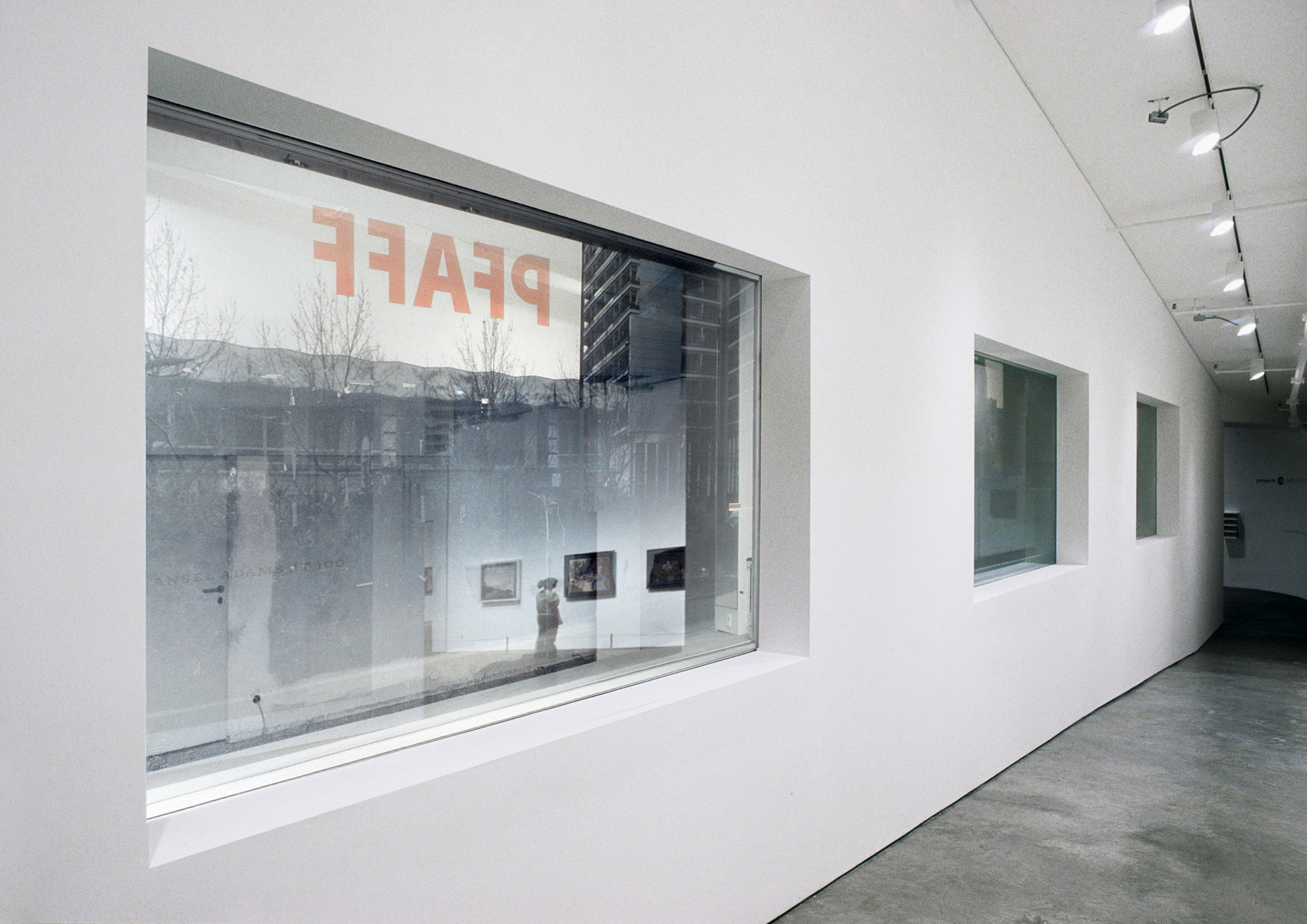 Installation mit 4 transparenten Fotos von leeren Schaufenstern, die zwischen zwei Glasscheiben in eine Wand eingebaut sind. Die Wand teilt mittig den Raum, so dass die Bilder von beiden Seiten aus zu sehen sind, der Raum dahinter wirkt wie eine Spiegelung des Raumes davor. Der Blick geht beim Betrachten der Bilder aber auch durch das Fenster-Bild hindurch in den dahinterliegenden Raum, der das transparente Bild erst hervorbringt. Er überlagert sich mit dem Bild und auch mit Personen, die dasselbe Bild von der anderen Seite aus betrachten.