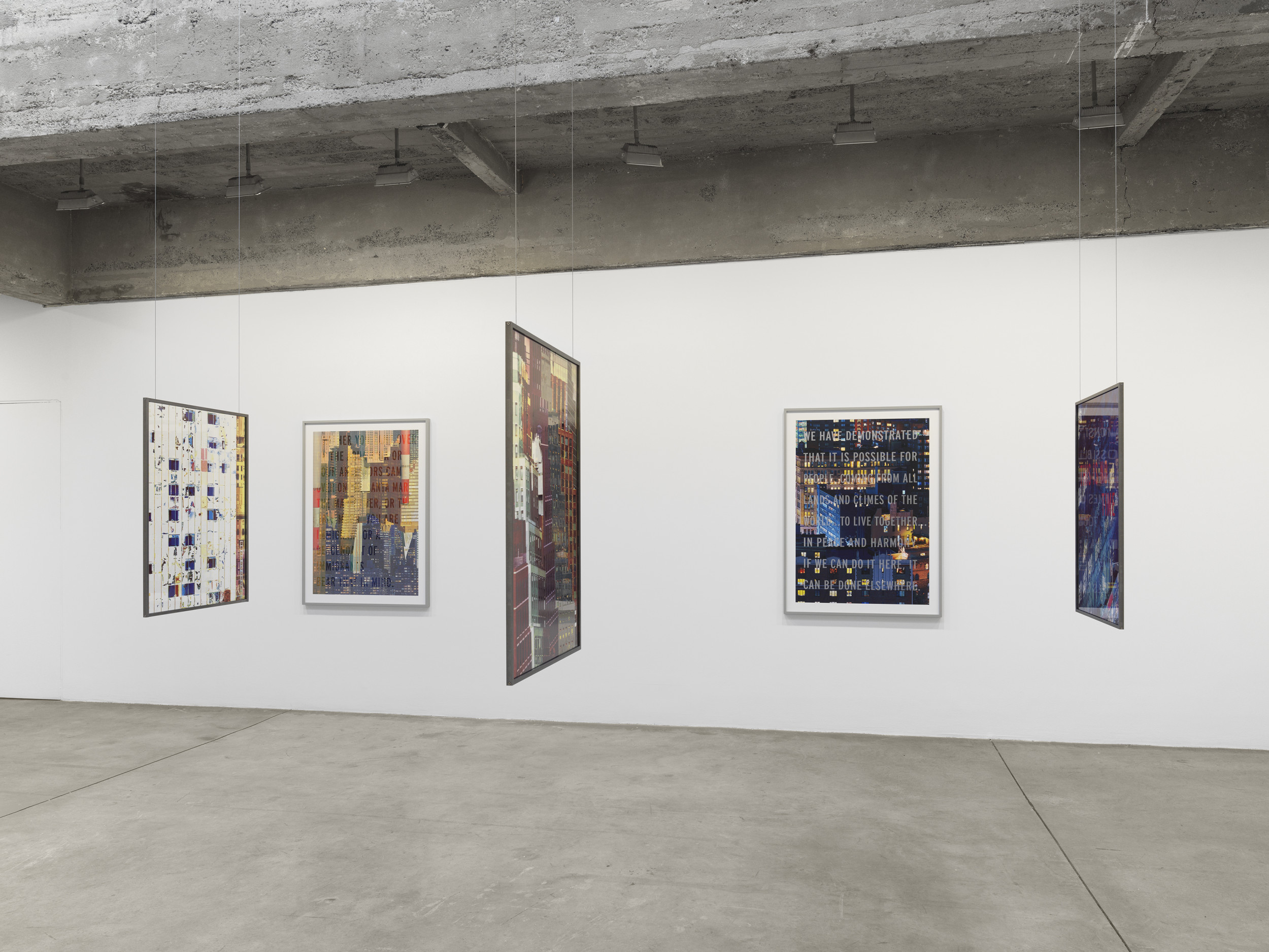 While reflecting on New York, Hornig was inspired by the 1939 World’s Fair (Your World of Tomorrow), which fostered building projects that championed democratic ideals and modernity at a time when Europe was backsliding into nationalistic dictatorships and war. Hornig combines intricate details from contemporary images of the cityscape with Mayor Fiorello La Guardia’s iconic phrases from this period to speak to critical themes in civil society that are timelessly present. Resembling political posters, the works transcend time via layers of the city’s architecture.