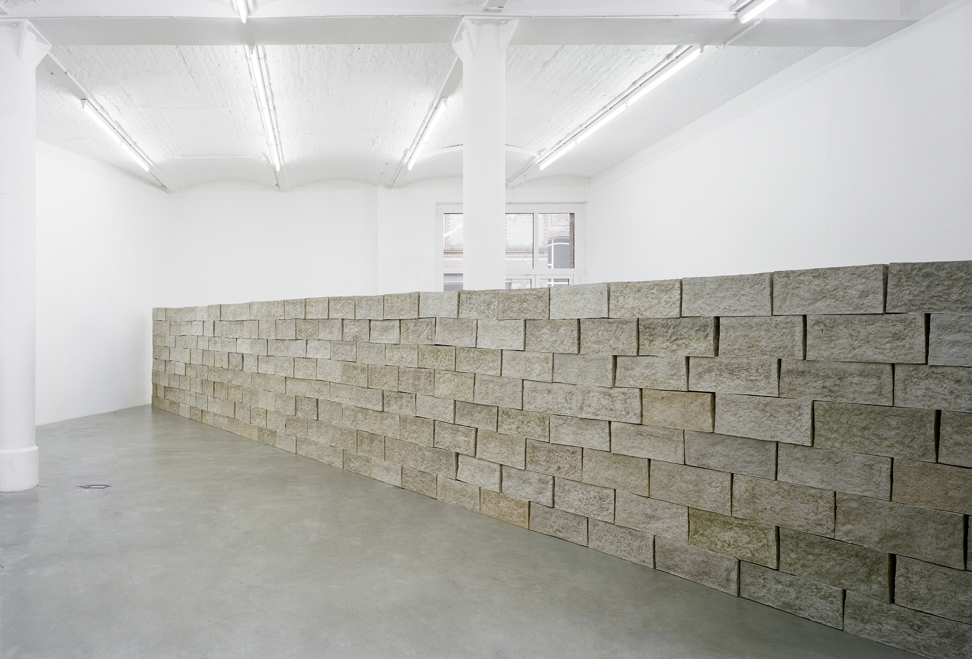 Eine Mauer erstreckt sich diagonal von einer Raumecke zur anderen. Die Steine sind aus Papier, wirken jedoch schwer und dem Alter nach unbestimmbar. Sie sind ohne Befestigung aufeinandergestellt, Spalten entstehen, durch die man sehen kann.