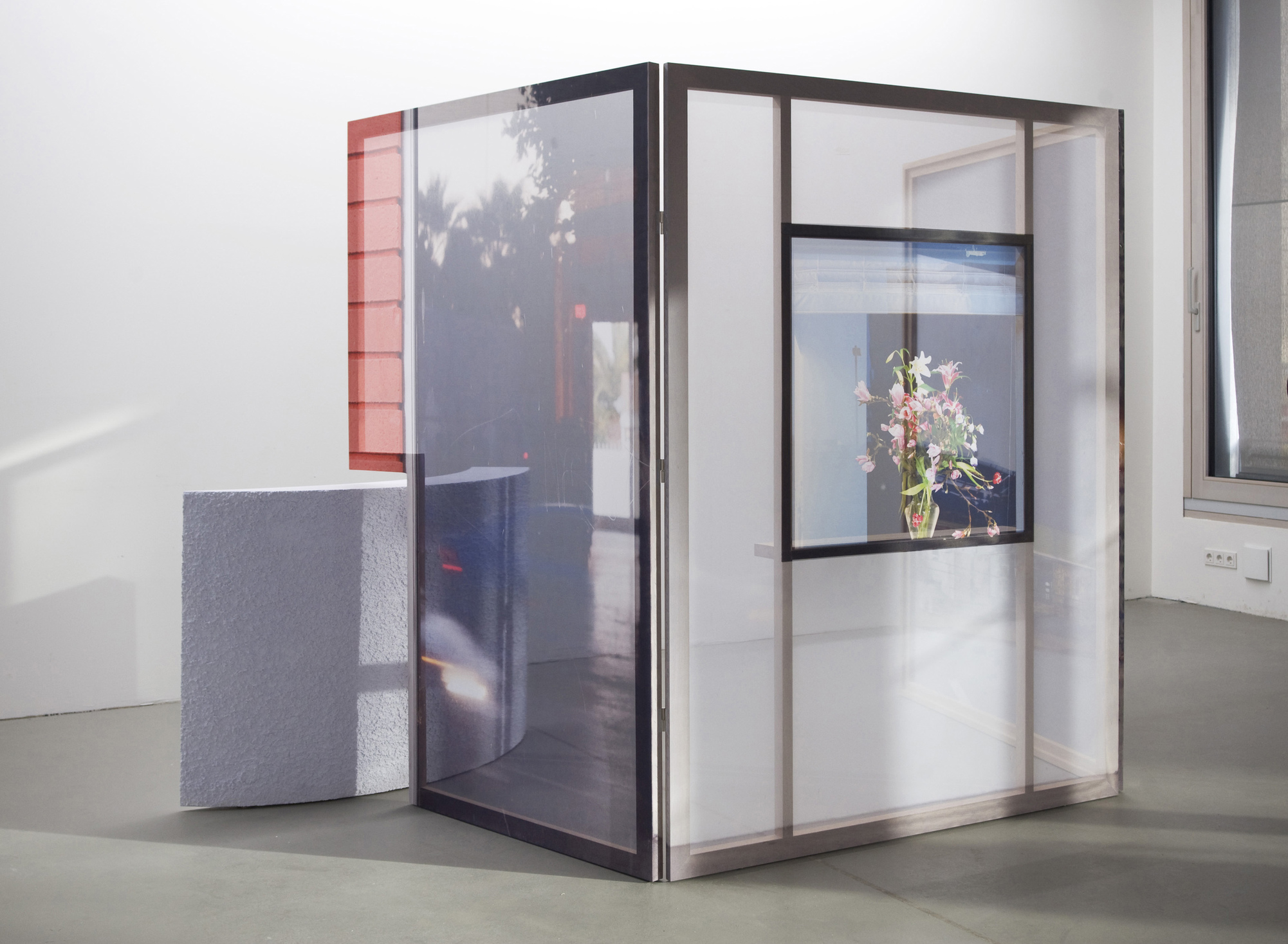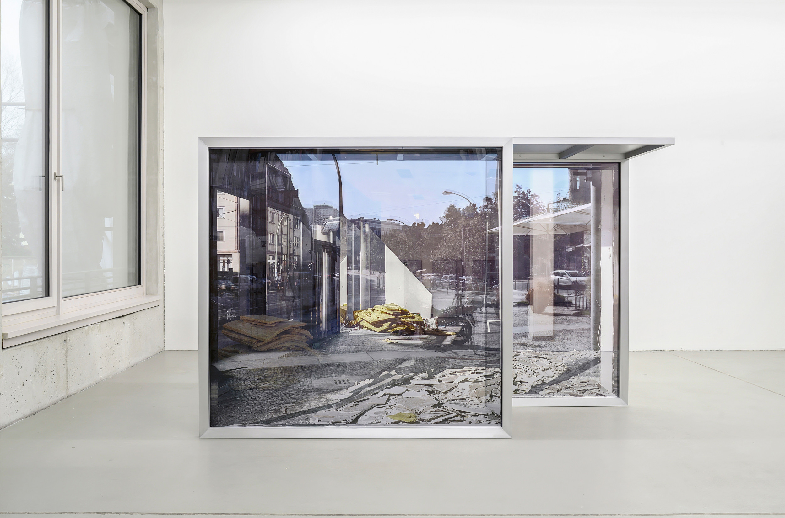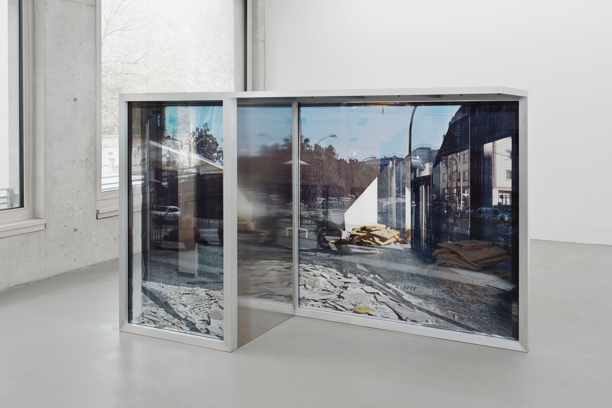 Großes Eckfenster, 2012, Aluminium, Holz, Sublimationsdruck auf Polyester, Beton, 213 x 163 x 280 cm und 80 x 30 x 35 cm