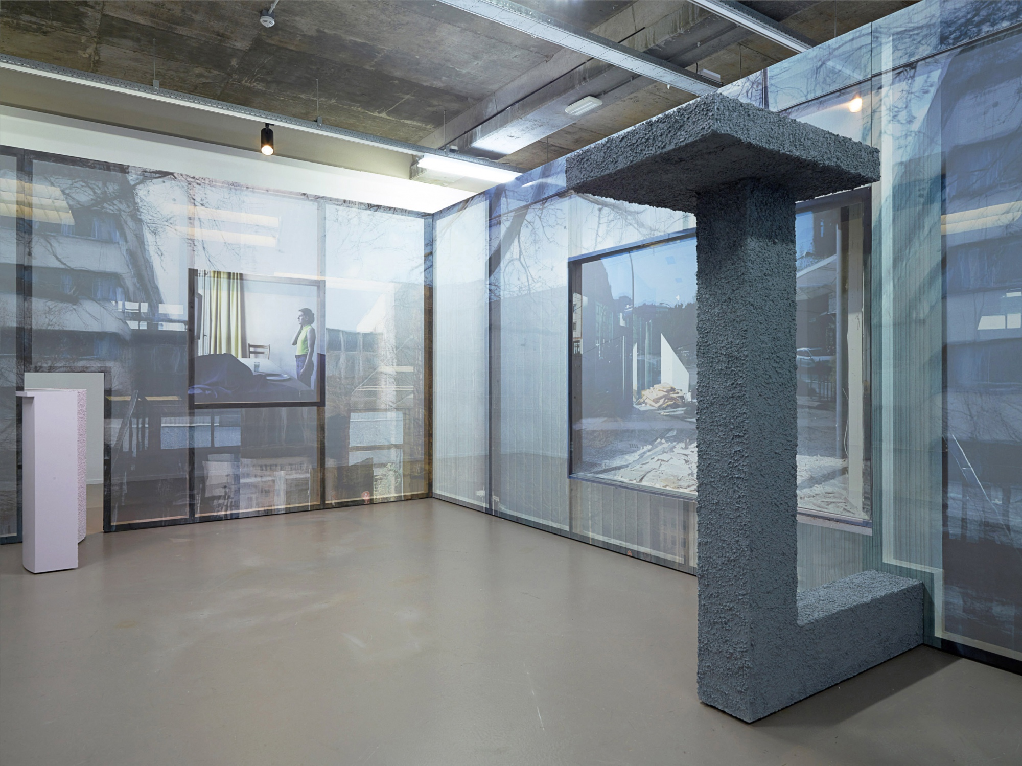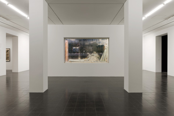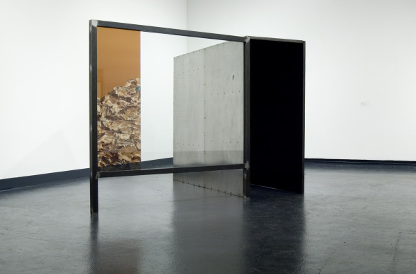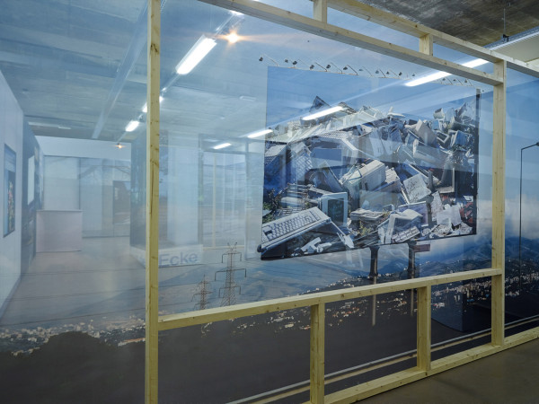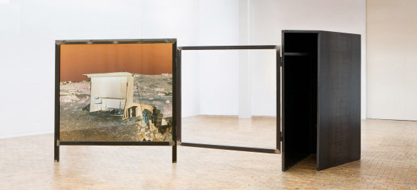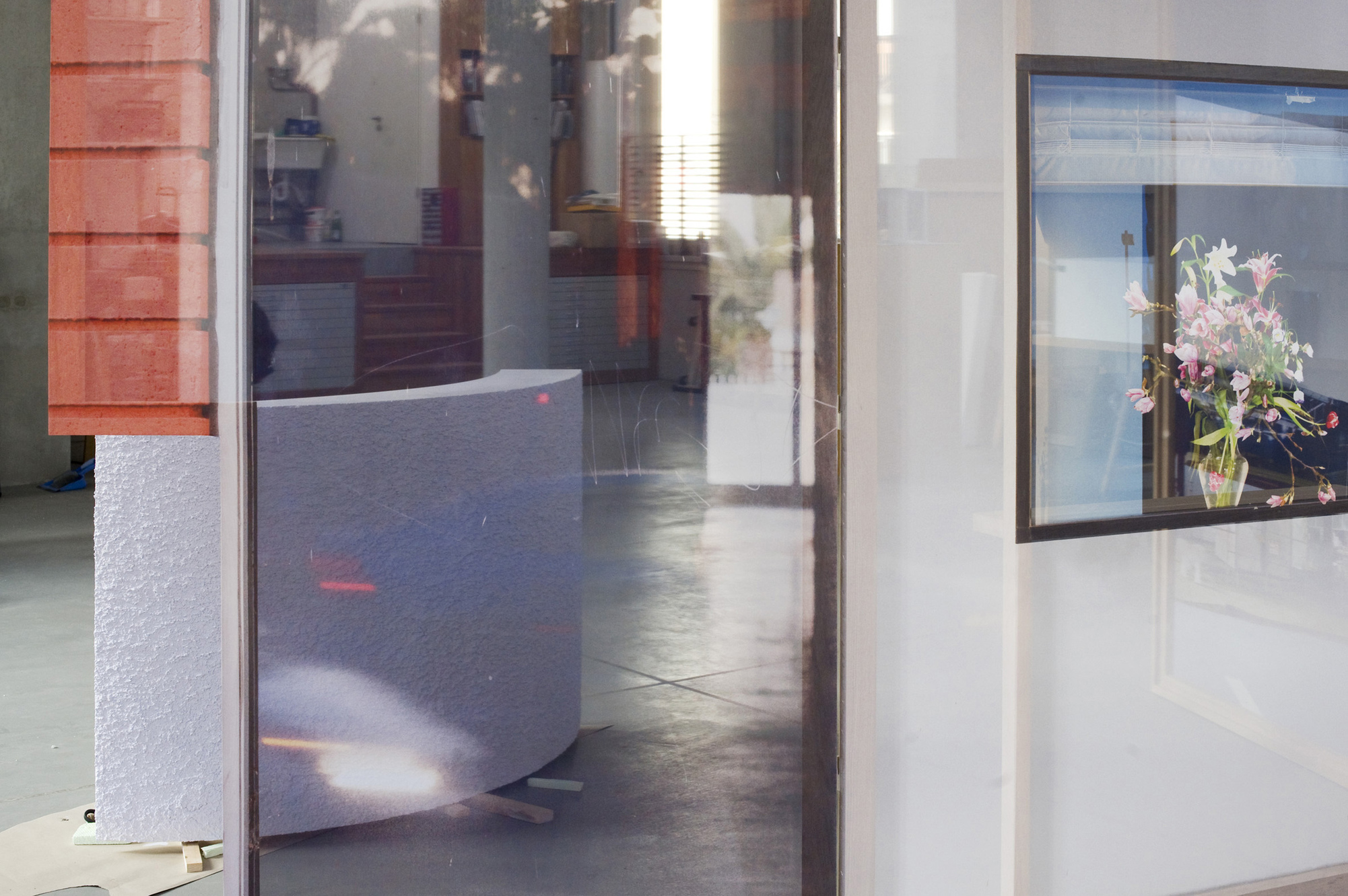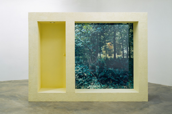 Großes Eckfenster, 2012, Aluminium, Holz, Sublimationsdruck auf Polyester, Beton, 213 x 163 x 280 cm und 80 x 30 x 35 cm