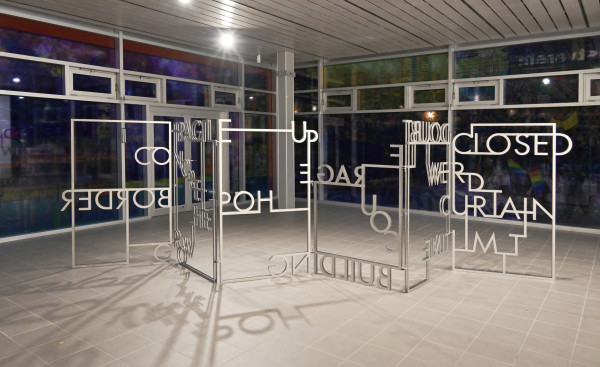 Triptychon: Store Closed, 2018, Metall, Glas, transparenter Siebdruck, Scharniere, 230 x 260 x 90 cm, Edition: 2