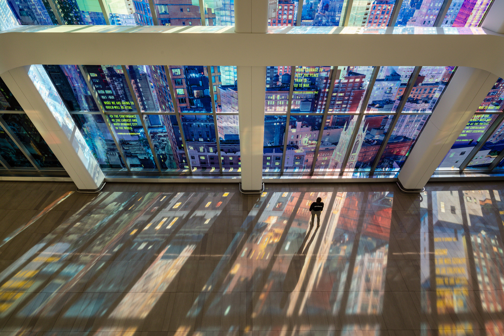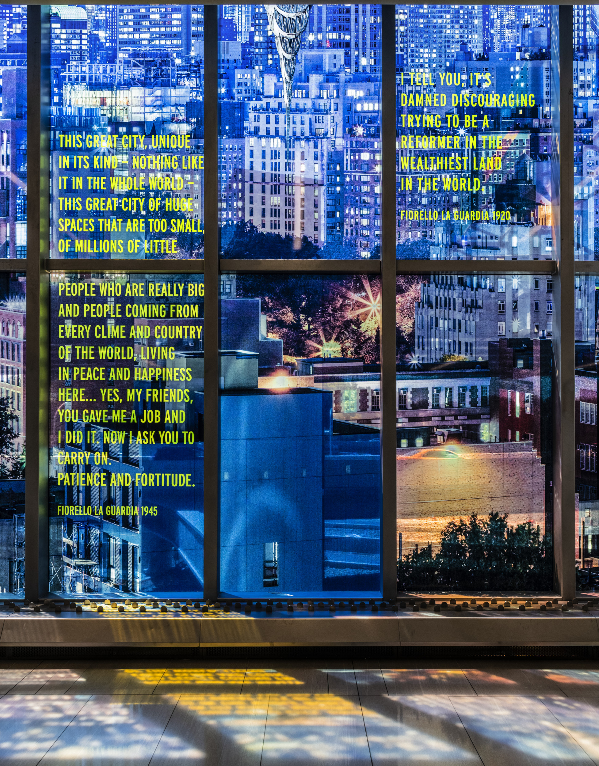 The work brings together the New York skyline and textual elements, weaving fragments from the speeches and writings of