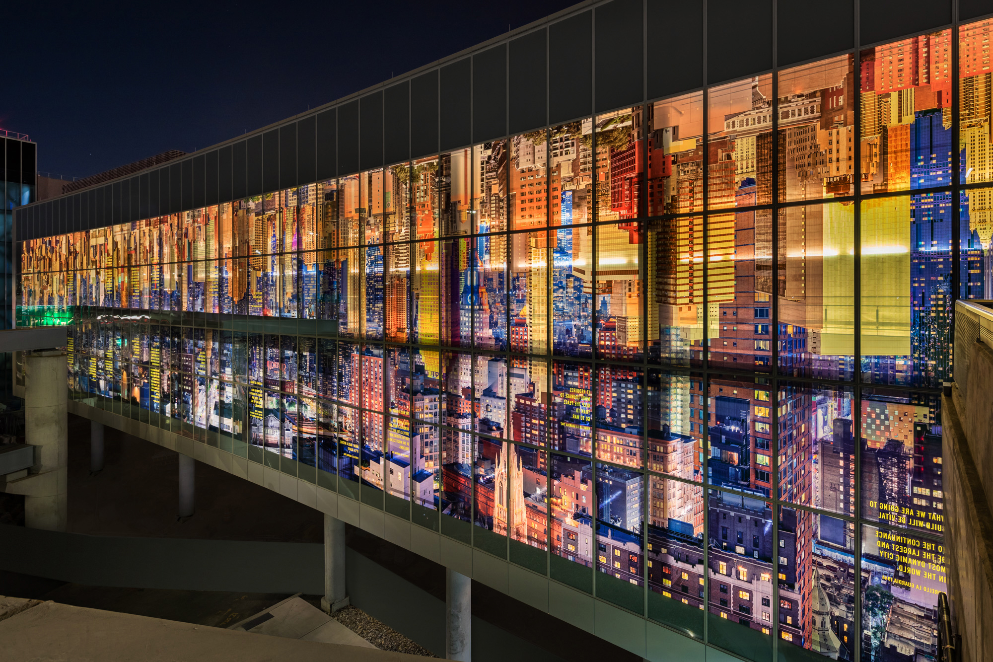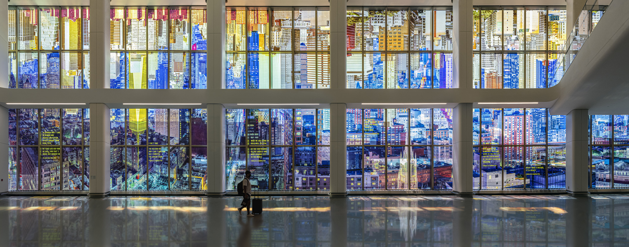 La Guardia Vistas is a large photographic artwork on glass, in which passages of text are incorporated. It is installed on the window of the pedestrian connector bridge of LaGuardia Airport’s new Terminal B, and depicts a dramatic invented image of an inverted New York City skyline washing the connector with color, image and text.