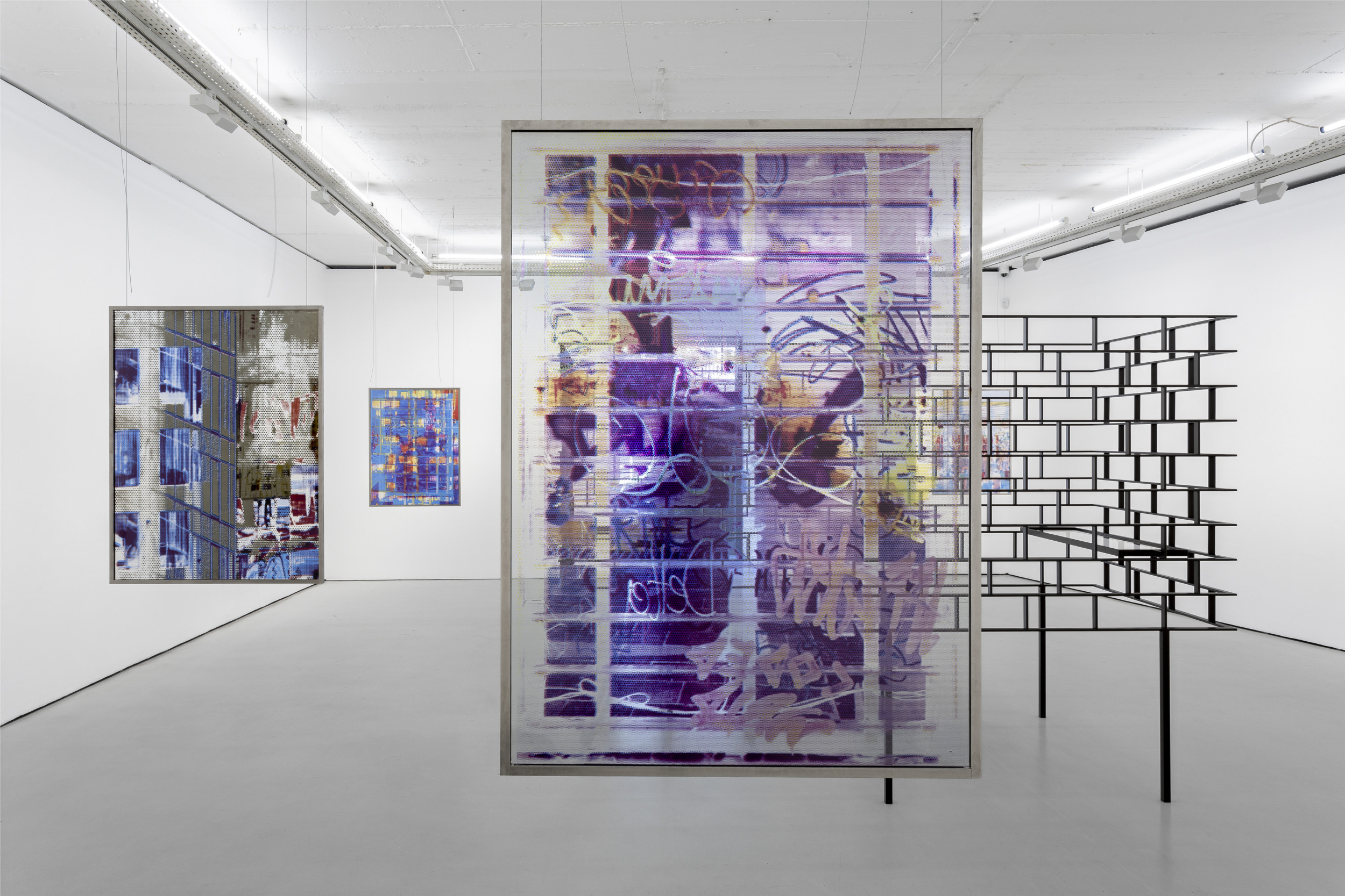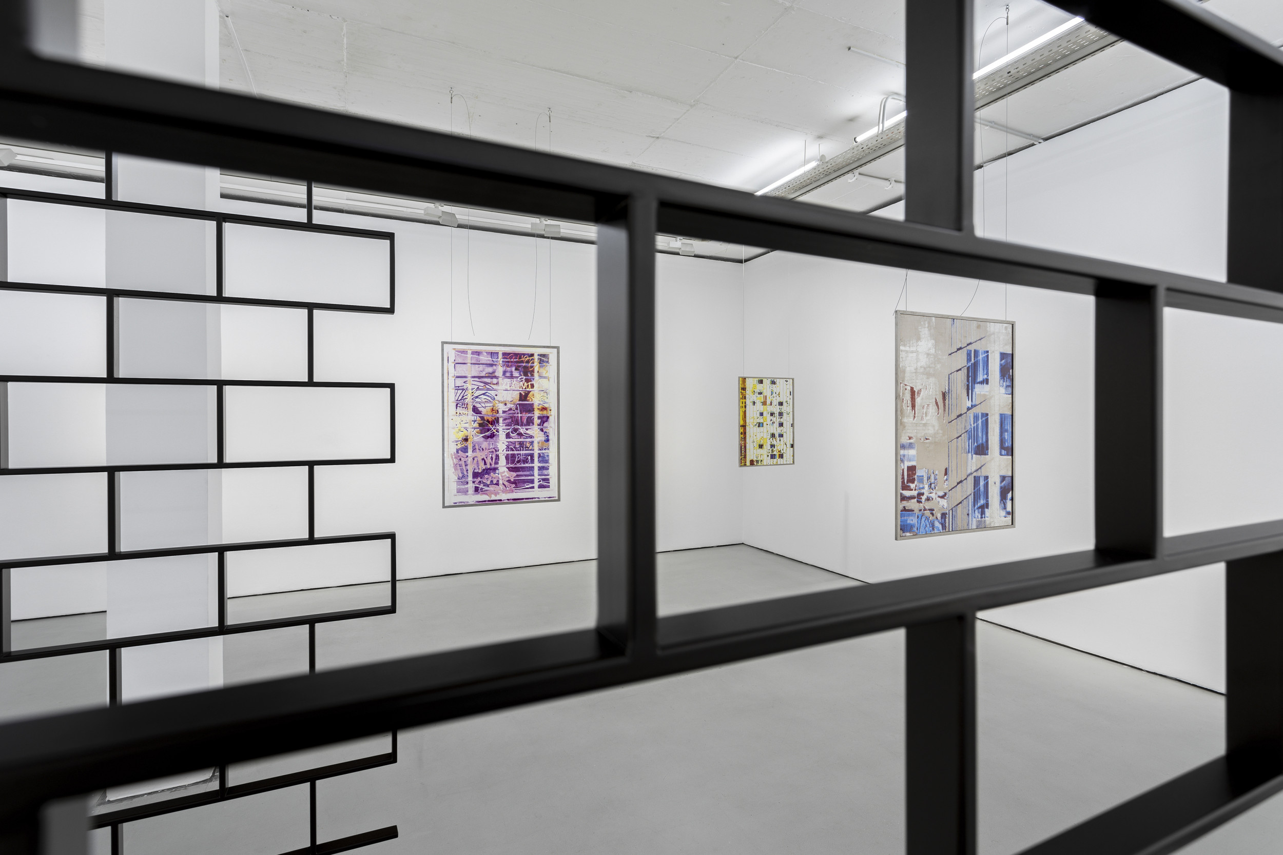 In another set of works, sheets of glass are suspended mid-air, suggesting windows within invisible walls that subtly divide the gallery. These glass pieces feature compositions rendered in ceramic paint, which glow in fragmented patterns, resembling coded reflections of unseen environments. Found graffiti elements intertwined with iconic imagery, including a photograph of the 1989 East Berlin demonstrations that precipitated the fall of the Berlin Wall, and fragmented urban elements from Berlin, Tbilisi and New York. These layered, translucent surfaces evoke fleeting associations, inviting visitors to explore ever-shifting perspectives.