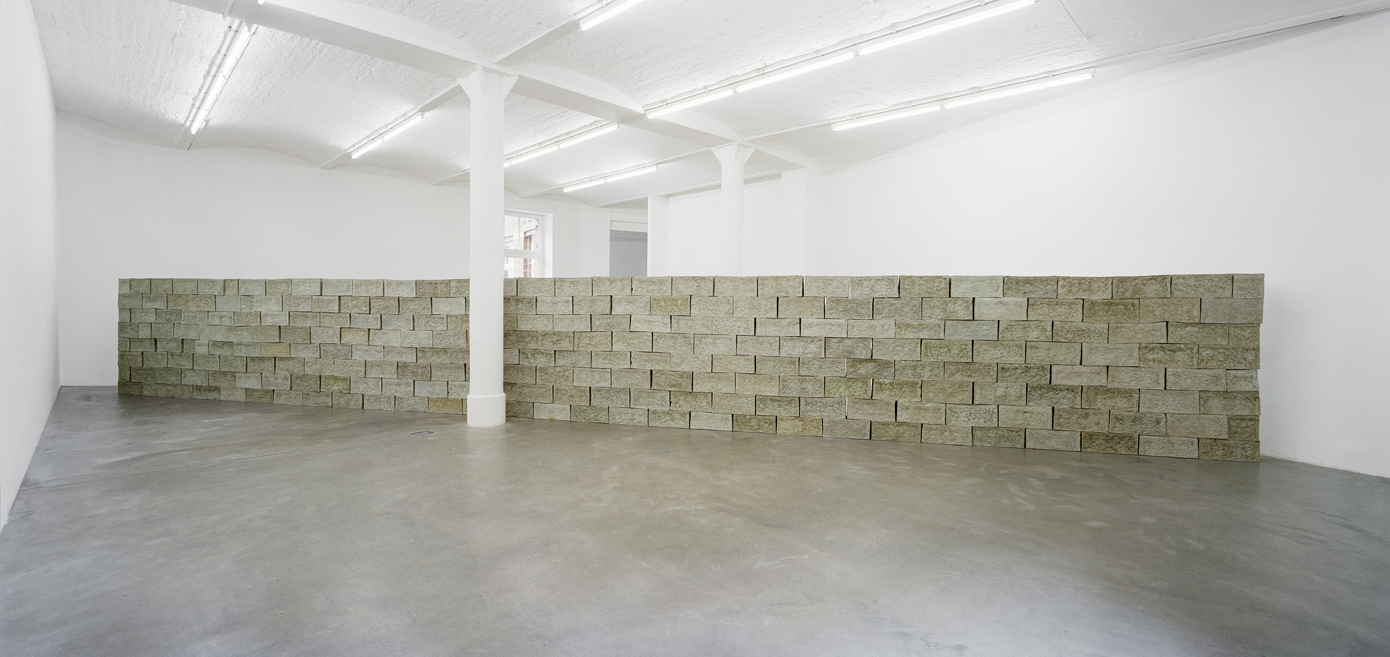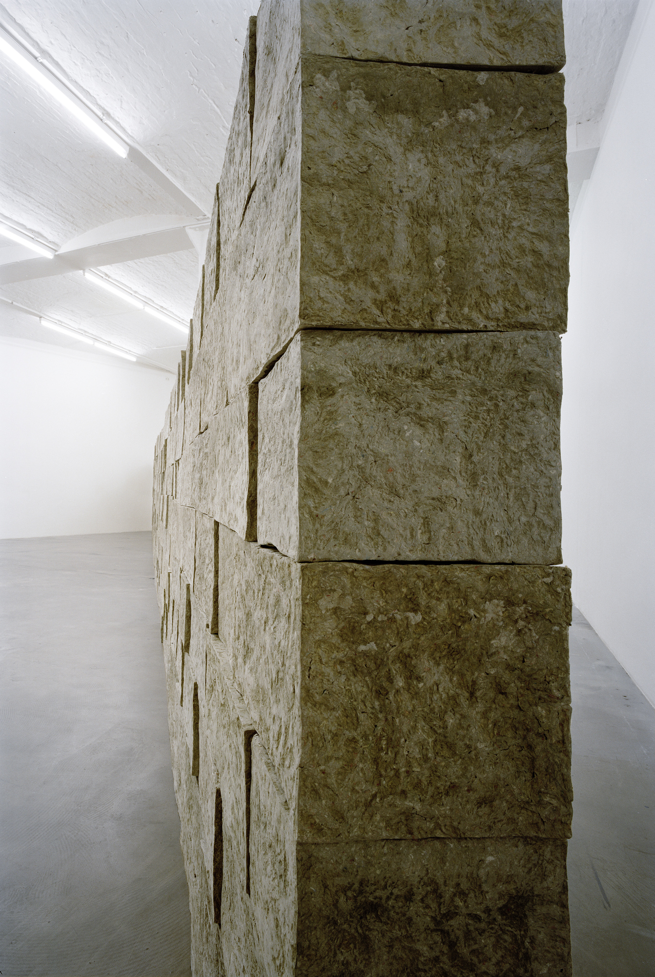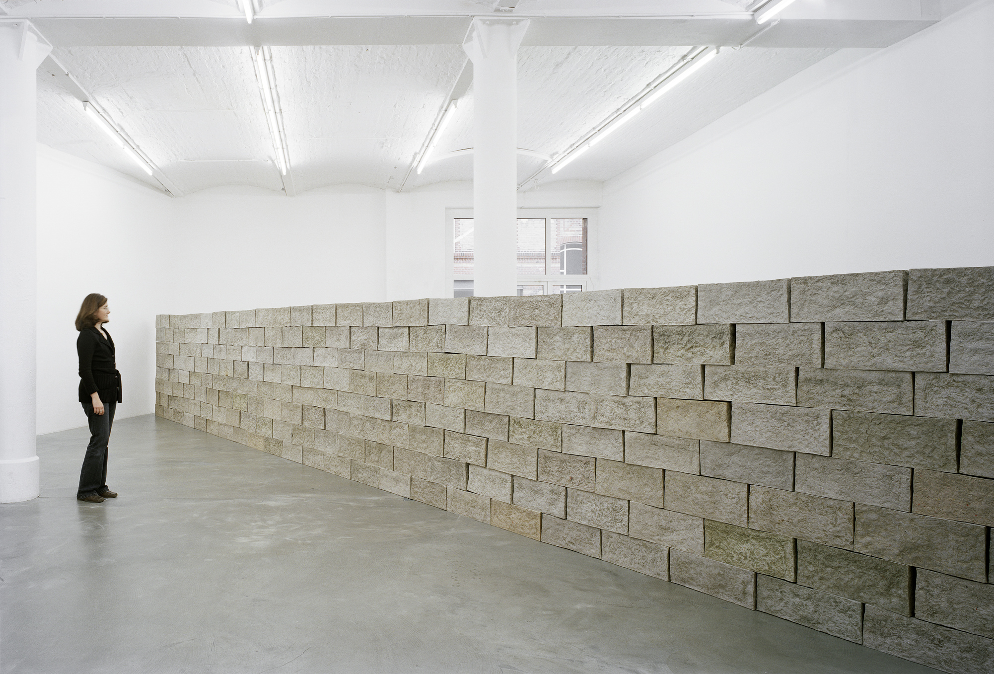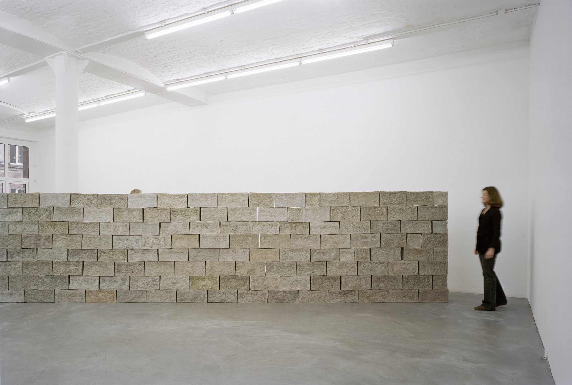 A stone wall extends diagonally through the space. The ‘stones’ are in fact made of paper but seem solid and heavy. Their age cannot be determined and they are stacked so that you can see through the gaps between them.